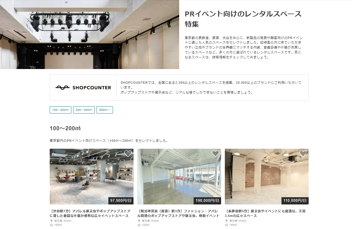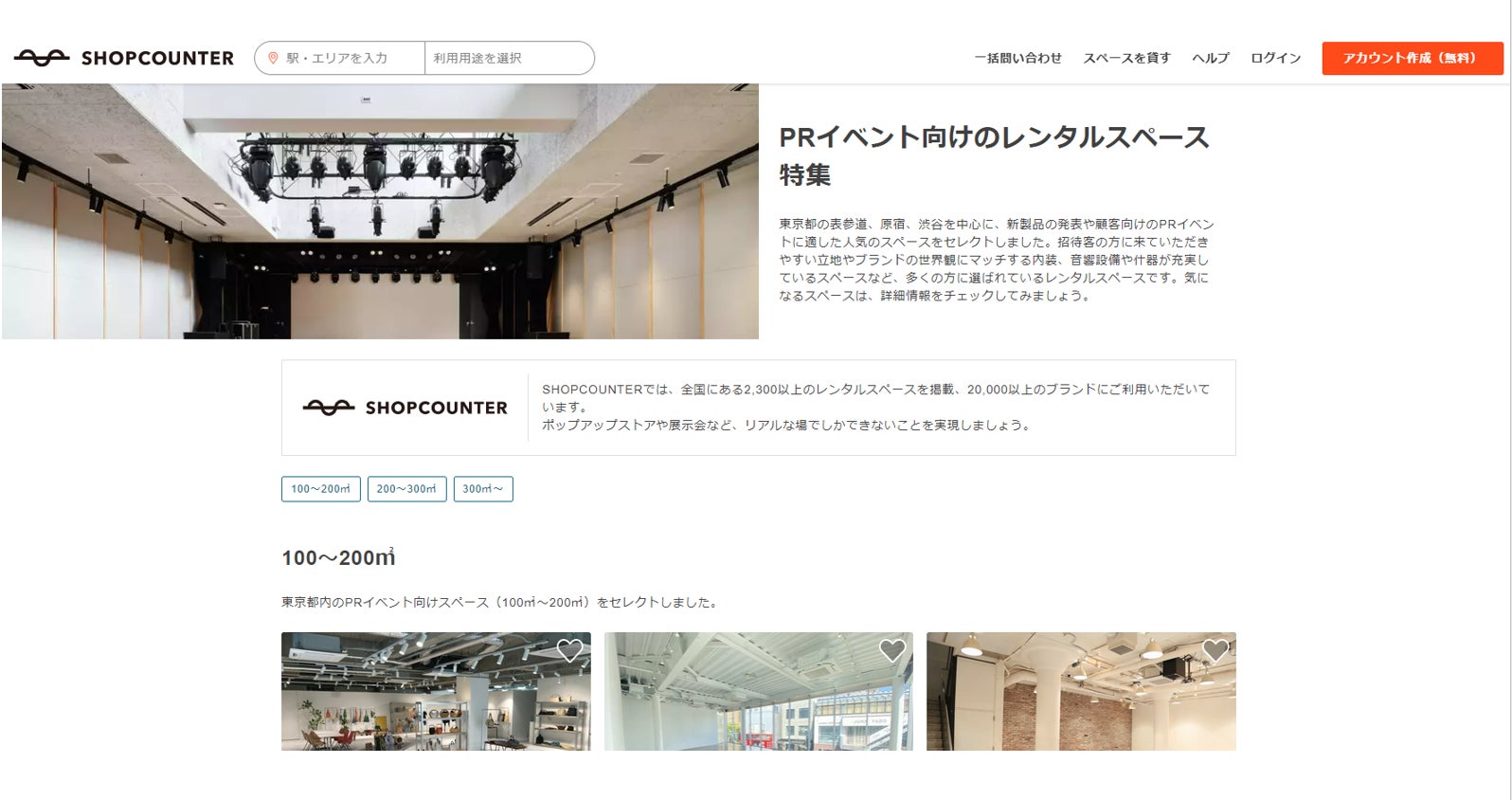 SHOPCOUNTER、イベント企画会社や広告代理店の方に特におススメ「PRイベント向けのレンタルスペース特集」を公開