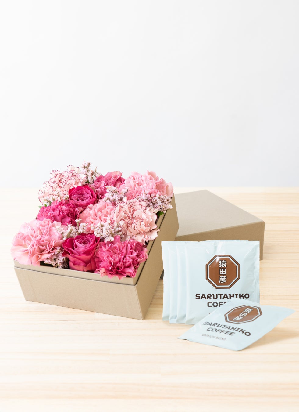 【母の日】猿田彦珈琲 大吉ブレンド ドリップバッグ 5枚入りとカーネーションとバラのボックスフラワー ピンク 6,400円税込