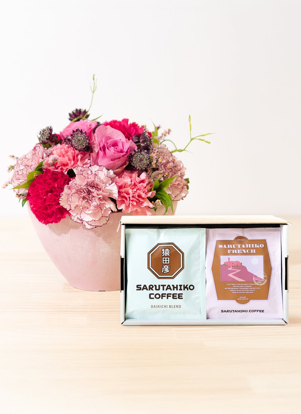猿田彦珈琲が厳選した【大吉ブレンド・猿田彦フレンチ】の2種のコーヒーと、HitoHanaならではの華やかなフラワーギフトがひとつになった本セットは、大切な方へ贈る「ひとときの癒やし」として最適です。