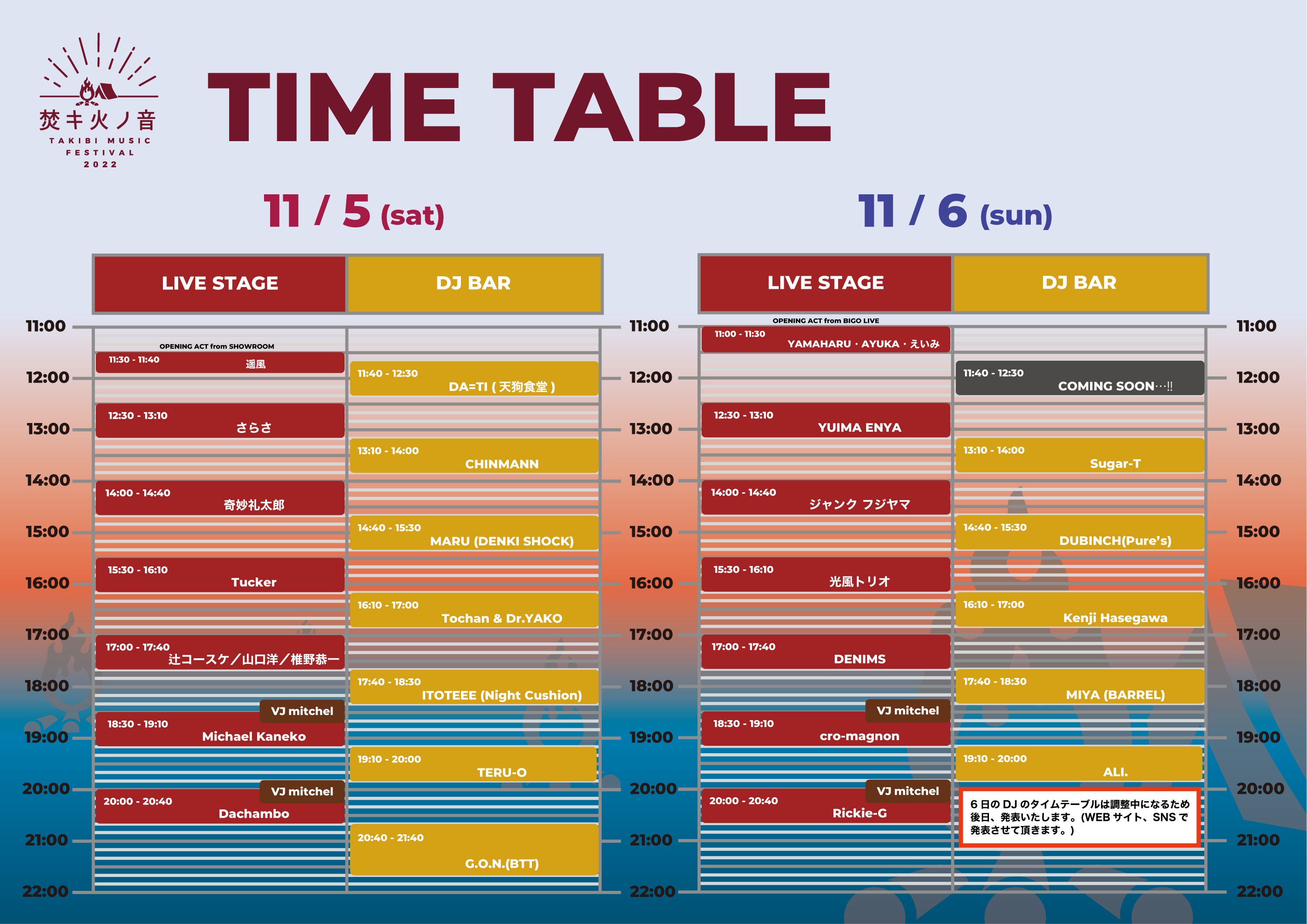 「焚キ⽕ノ⾳ -TAKIBI MUSIC FESTIVAL 2022-」の追加アクトの発表に伴いライブステージのタイムテーブルも決定しました!