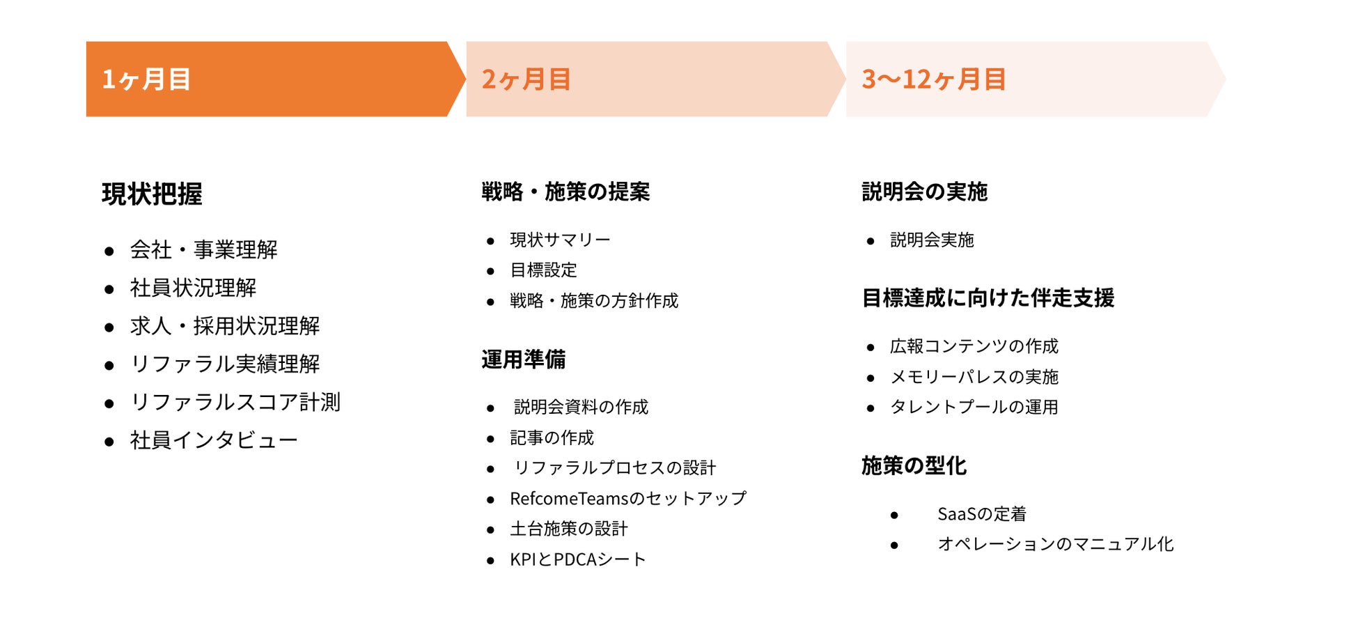 お客様の課題に応じて、コンサルタントや知見や工数を支援したり、クラウドサービスを活用してリファラル採用を仕組み化するところまでを可能にします。