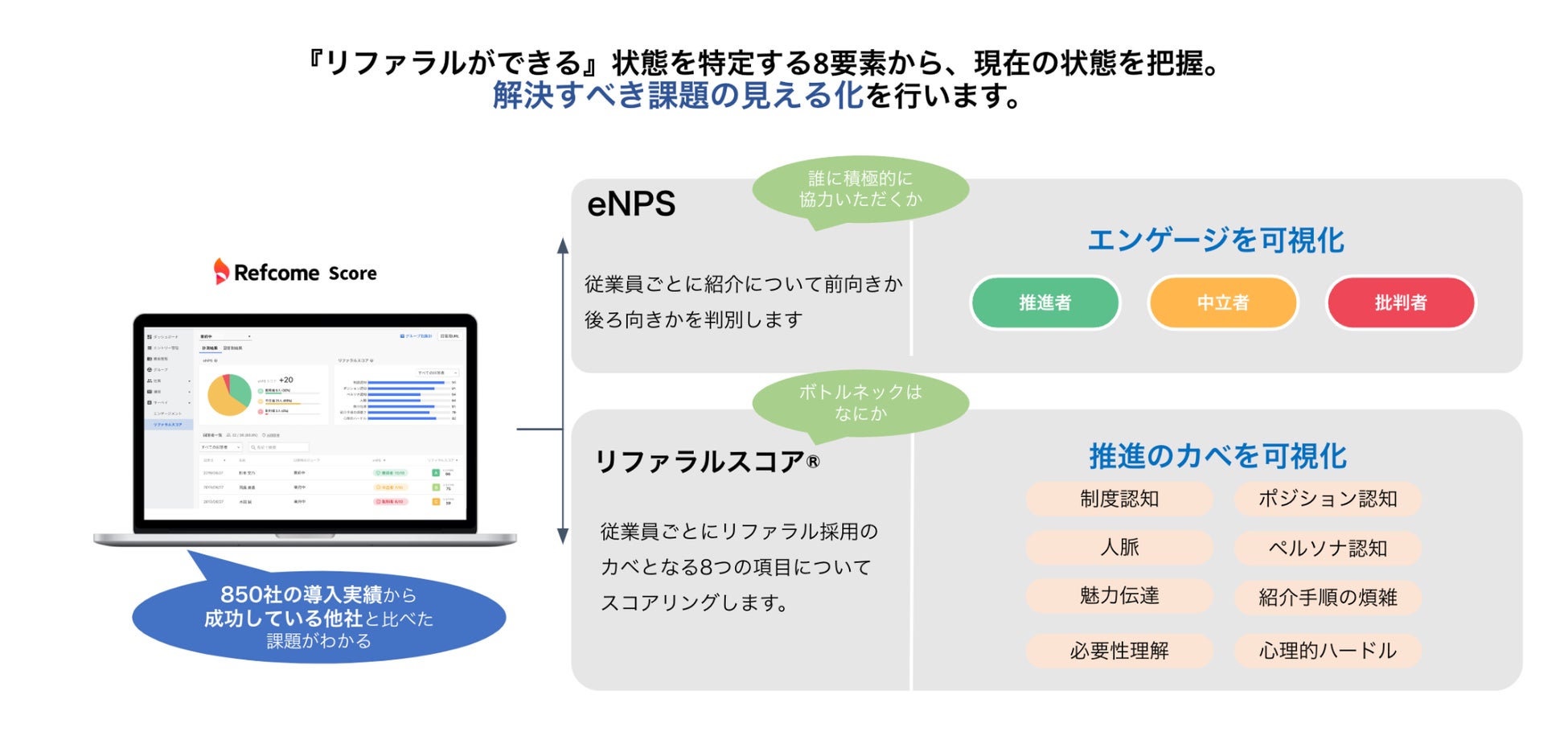 Refcomeが提供するリファラル採用の課題を特定するアンケートサーベイ「リファラルスコア」を用いて、現状のリファラル採用の課題を特定します。