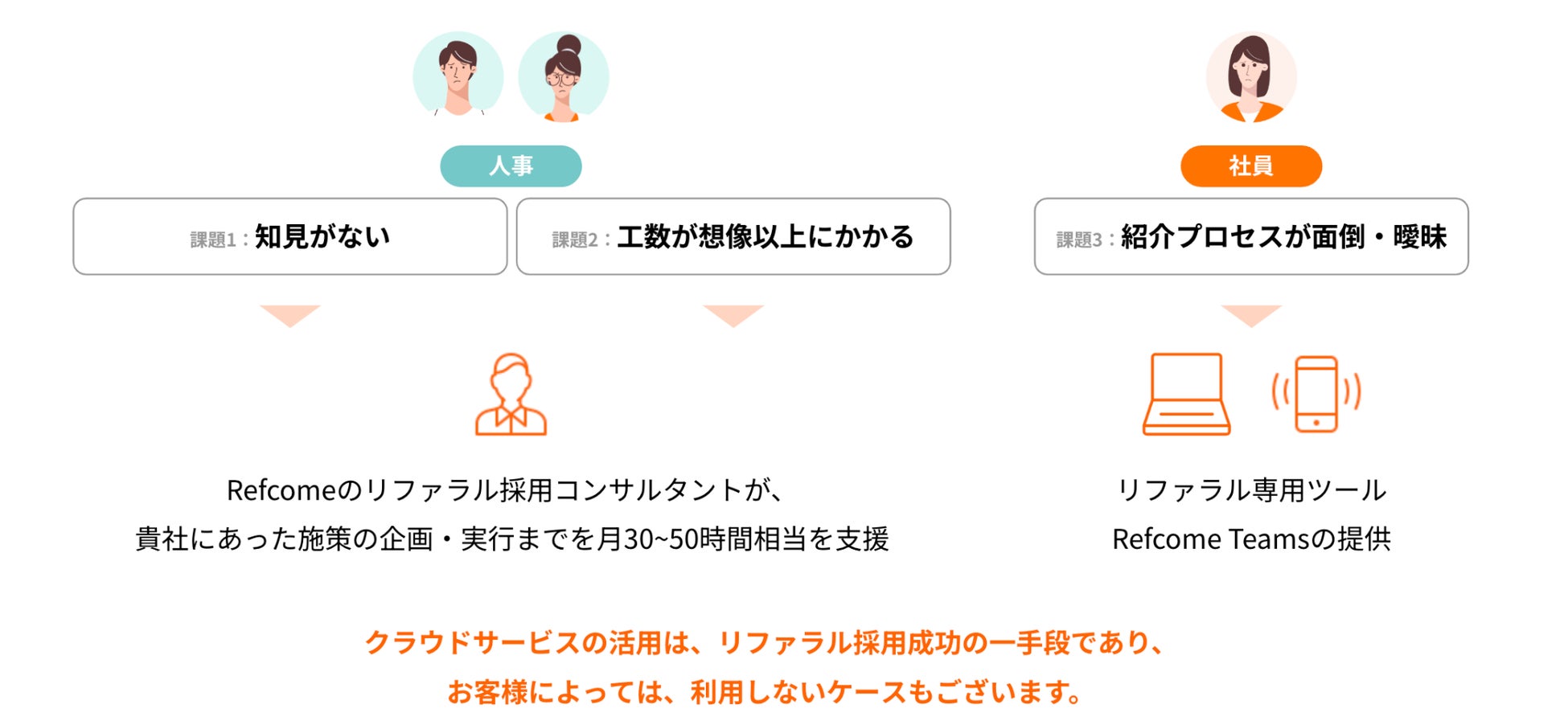 コンサルタントの入り込み支援とリファラル採用クラウド「Refcome」の提供