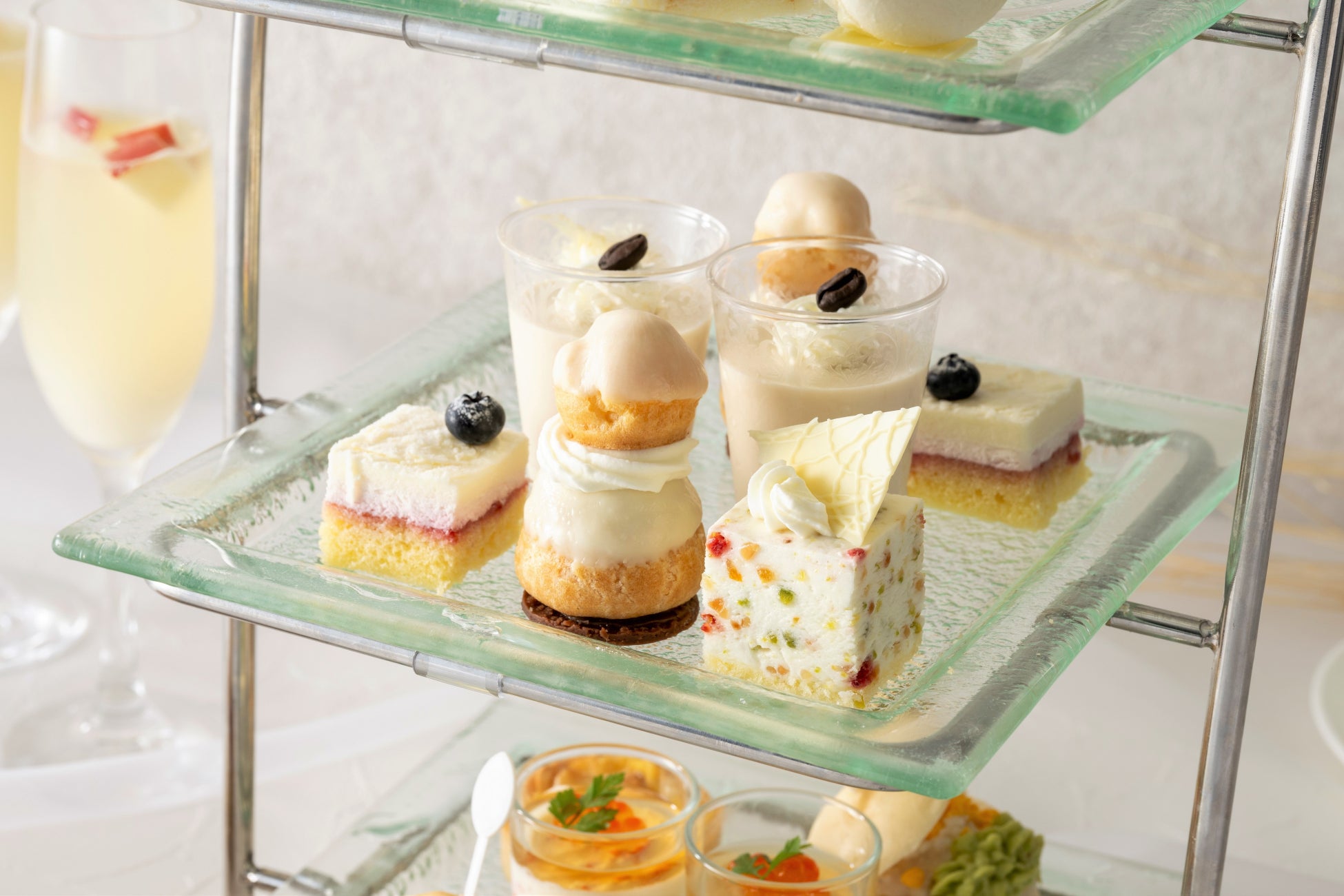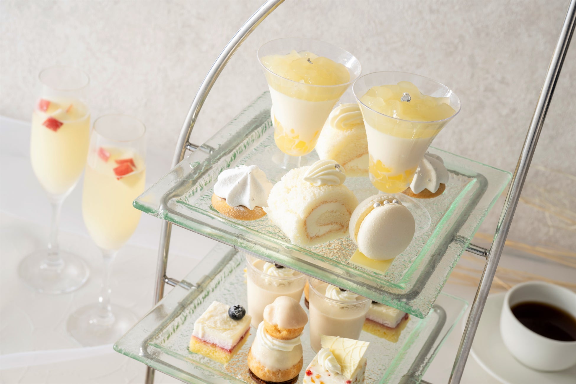 黄身まで白い卵 “ピュアホワイト”を使用し、雪のようなふんわり食感に仕上げた真っ白なロールケーキをはじめ、コーヒーが香り立つブランマンジェ、ホワイトチョコレートをまとった仏語で「修道女」を意味するルリジューズ、ナッツの食感が楽しいフランスの伝統菓子 ヌガー・ド・モンテリマールなど、フォトジェニックで味わい深いスイーツの数々がティースタンドをロマンティックに彩ります。
