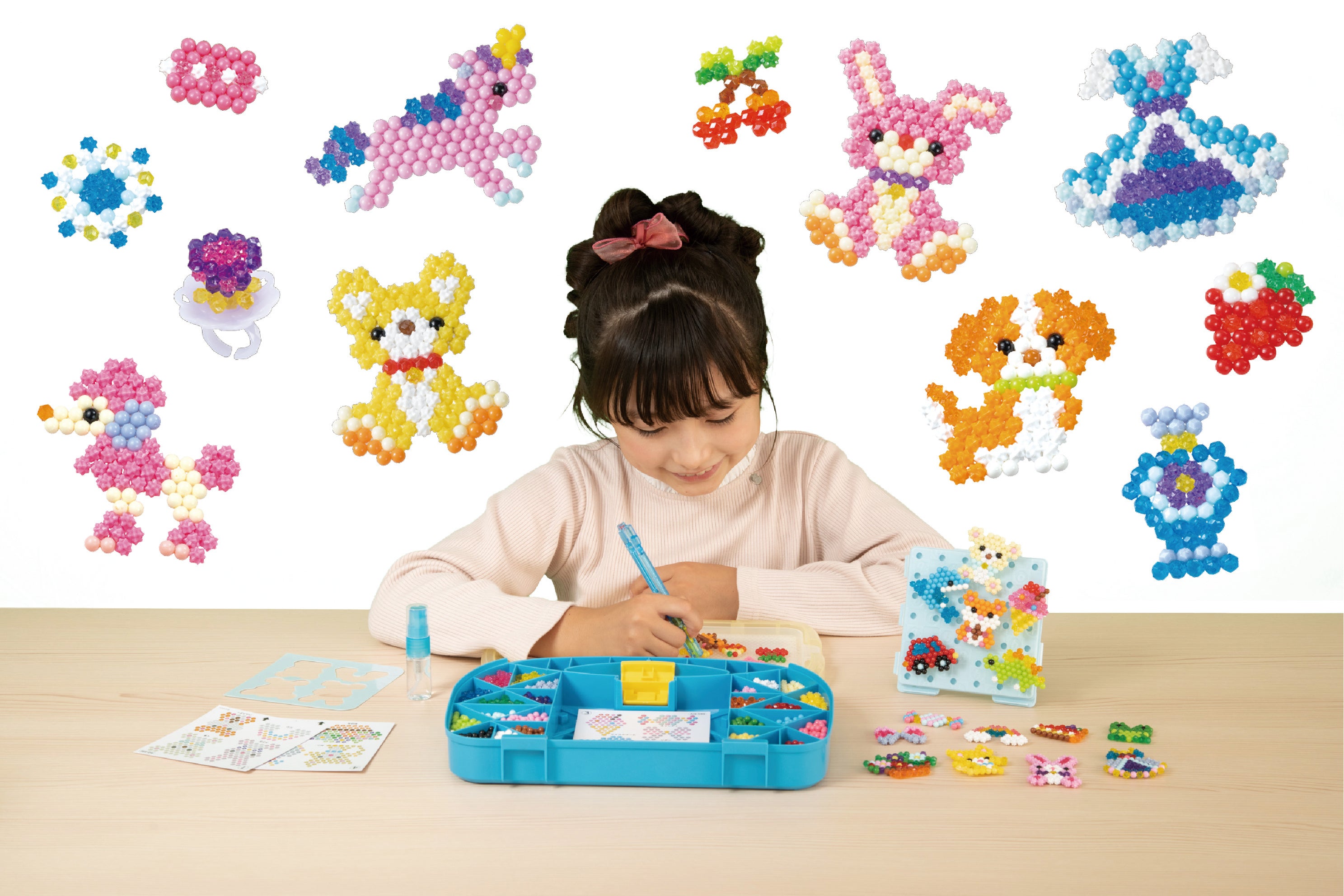 ビーズの色彩や形の種類も多く、また、専用ツールも充実・進化しているため、遊び方は無限大。平面だけでなく、自身の工夫次第で立体作品や大型作品といったアレンジも可能で、小さいお子様だけでなく幅広い世代の方に楽しんでいただけるのも特徴です。アクアビーズは、本年で発売より18年を迎え、その創意工夫の楽しさや、遊びやすさからたくさんのお客様に愛されています。【「アクアビーズ」の知育効果について】