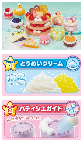 パティシエの練習用に開発された特殊なクリーム粘土「ホイップるクリーム」で、本物そっくりのスイーツ作品を作れる玩具シリーズです。「ホイップるクリーム」は生クリームの風合いにそっくりで、しぼり方によって美しいヒダやツノを形作ることができるのが特徴です。できあがった作品は、乾燥させると保存できるので、お部屋に飾ったり、アクセサリーとして身につけたりできます。
