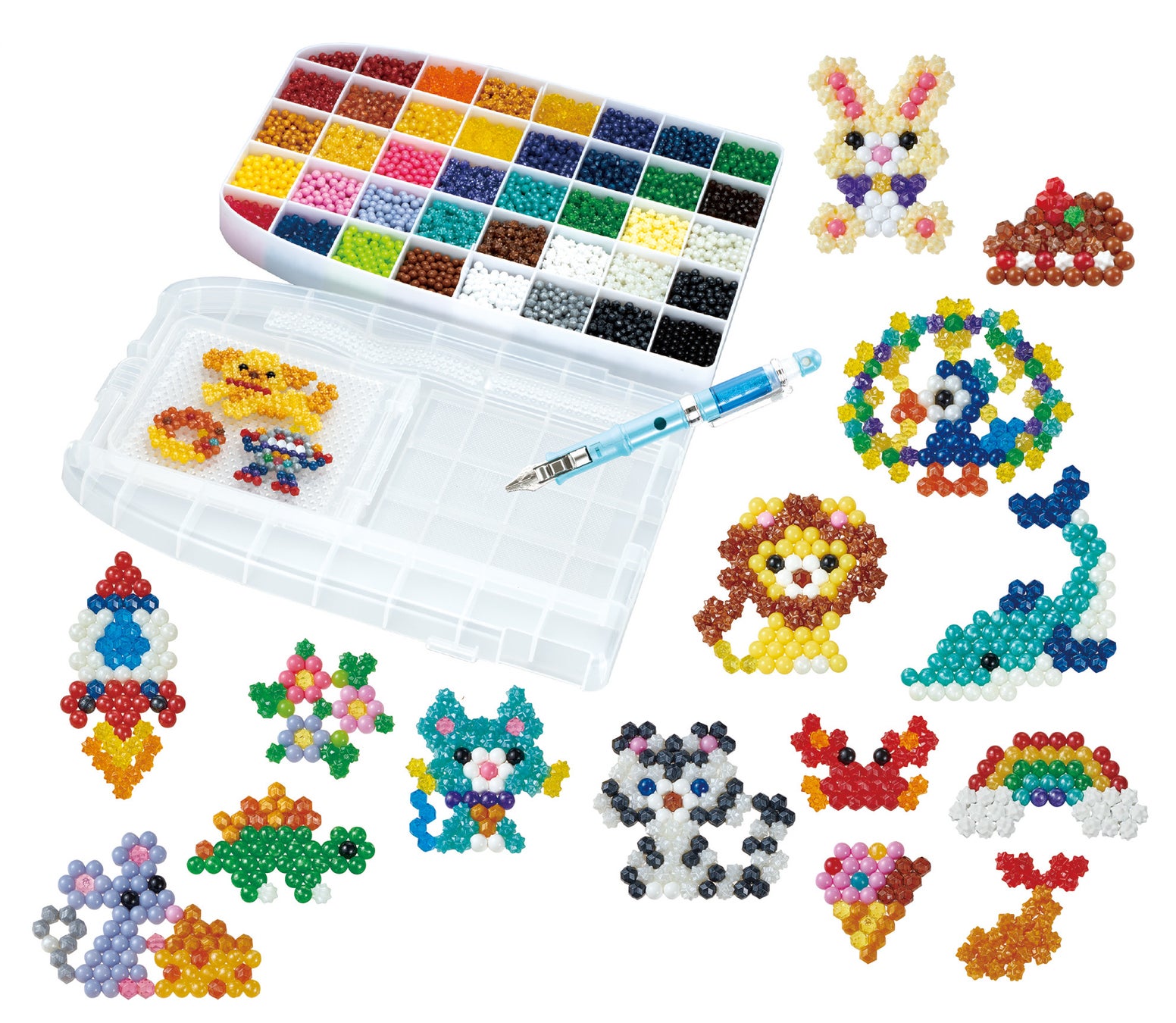 「アクアビーズ」はイラストシートに合わせてビーズを並べ、きりふきでお水をかけるだけで簡単にビーズ作品が作れるメイキングトイです。針や糸、アイロンなどを必要とせず、水だけで遊べます。また、ビーズは切手の裏の糊と同じ安全性の高い素材を使用しています。