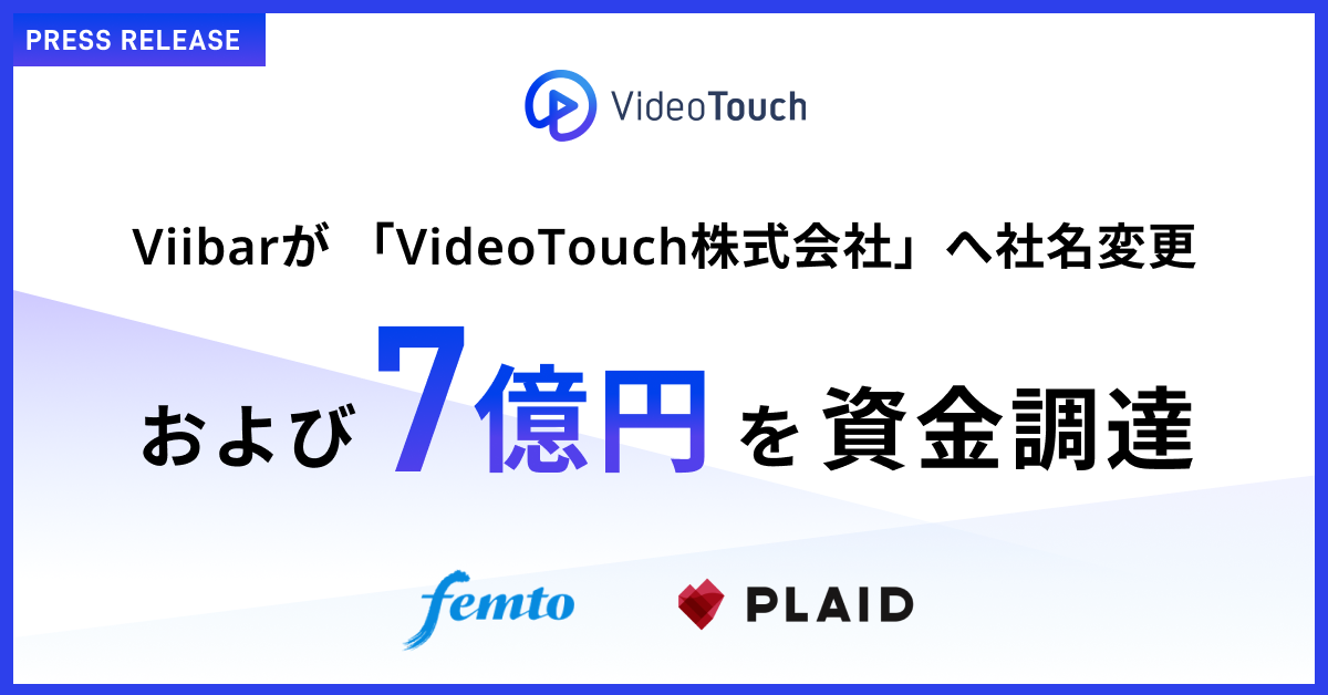 株式会社Viibar(ビーバー、本社:東京都渋谷区、代表取締役CEO:上坂優太)は、2022年8月1日、VideoTouch株式会社(ビデオタッチ株式会社)に社名変更いたしました。また、フェムトパートナーズ株式会社、株式会社プレイドの2社を引受先とする第三者割当増資により、7億円の資金調達を実施しました。