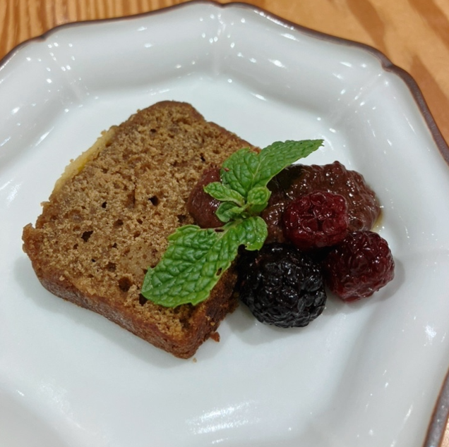 締めのデザートには、シナグロ ブリティッシュセレクション by マダムヒロミとして全国の百貨店催事「英国展」で販売している人気の「バナナジンジャーローフ」を自家製チョコレートカードとミックスベリーを添えてご提供いたします。