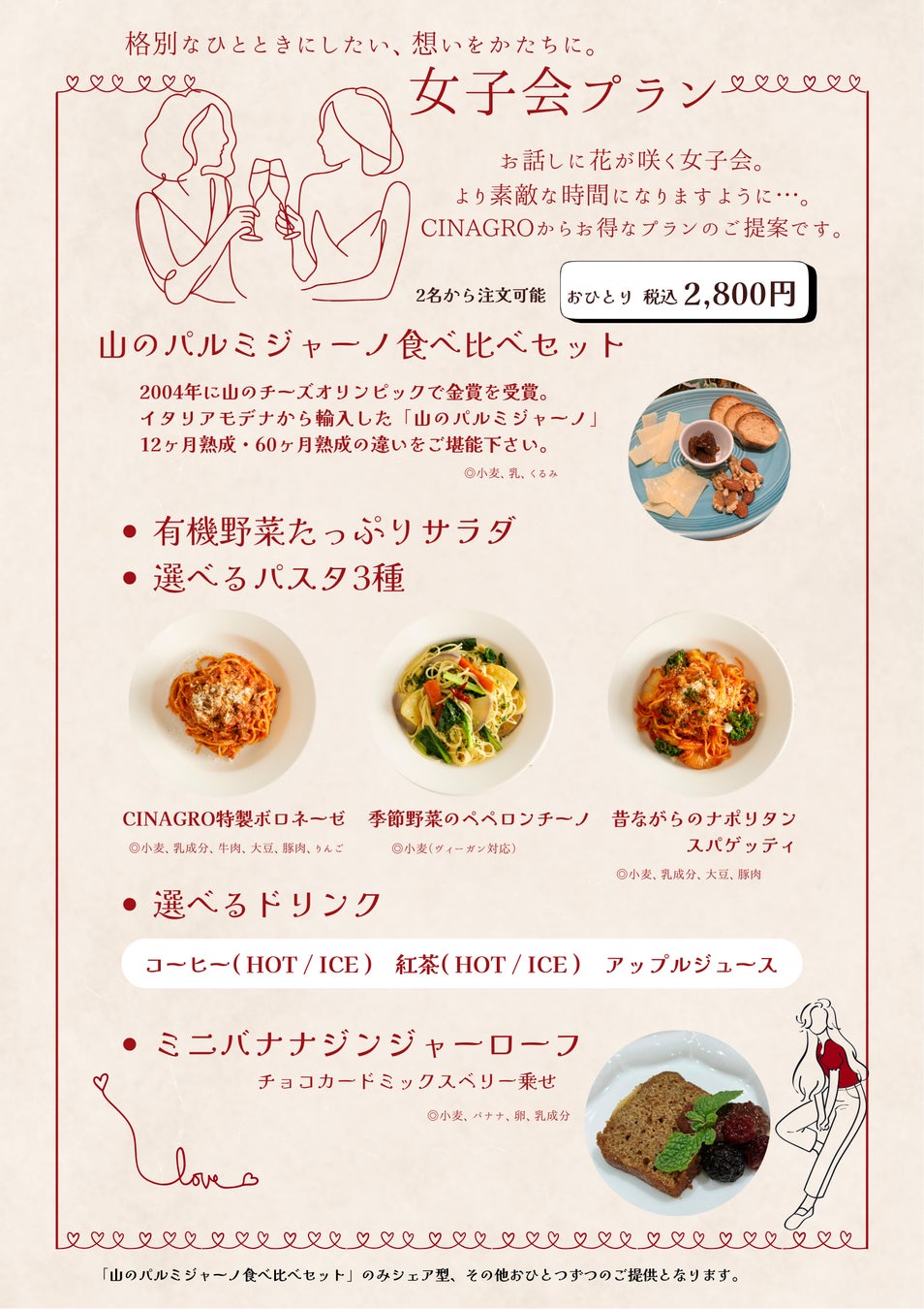 お食事セットの幅を広げ、アラカルトからデザートまでフルコースのラインナップでより充実した「女子会プラン」をご提案いたします。