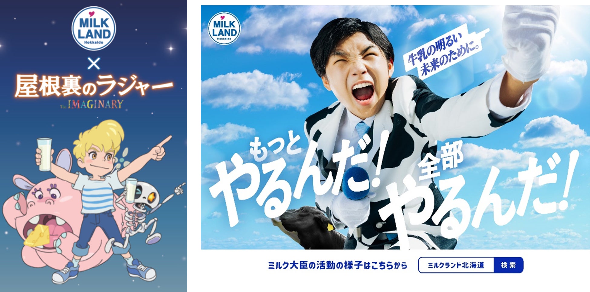 公開当日より『屋根裏のラジャー』とのコラボWEBCMが放映開始され、同日にTOHOシネマズ 日比谷にて行われる寺田さんらが登壇する初日舞台挨拶後に鑑賞者へ北海道産牛乳やミルクランド北海道オリジナル描きおろしステッカーを配布予定です。(また同日、TOHOシネマズ 日比谷にて映画『屋根裏のラジャー』鑑賞者先着500名へ配布予定です。)さらに、今後ミルクランド北海道による「ミルク大臣」キャンペーンとのコラボ企画も実施予定です。