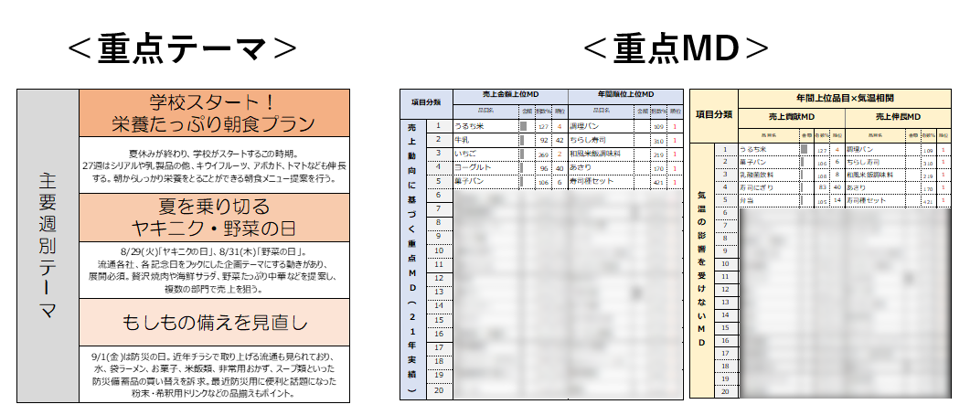 各週の歳時・生活行動、気象傾向、社会行事といった環境与件とPOSデータを分析し、52週毎に重点的に取り組むべきテーマ・MDを掲載しています。客観的データに基づいた重点テーマ・MDにより、月や週・日々の販売効率をより高めることができます。