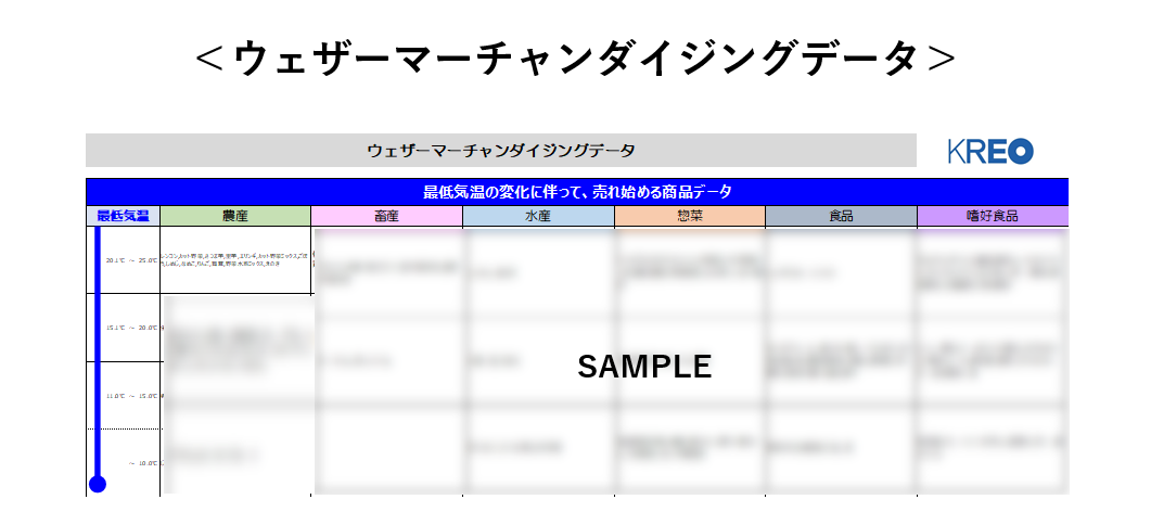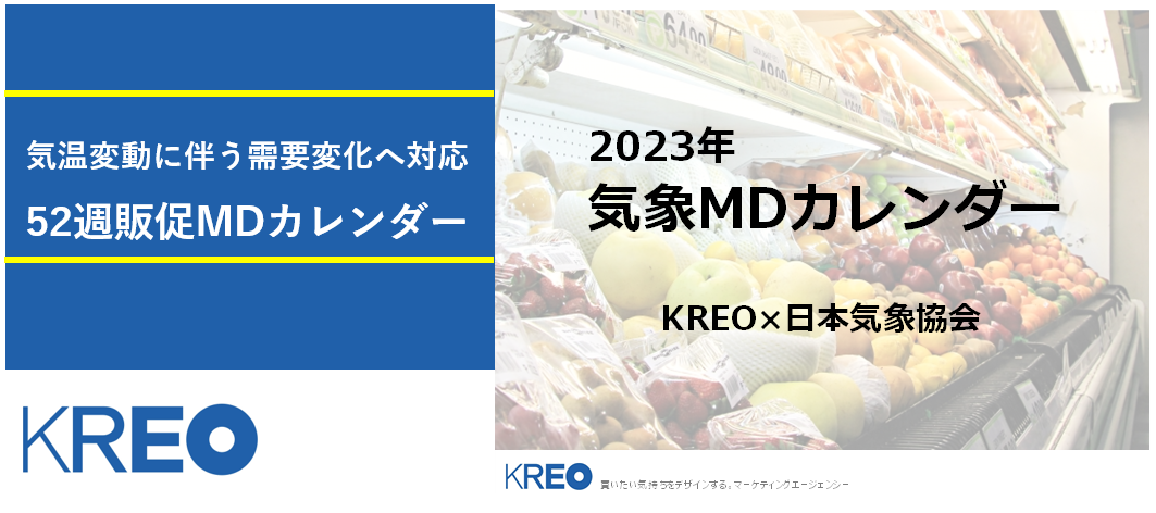 気象MDカレンダーは、50年にわたって企業の販促・マーケティング支援を行ってきたKREOと、気象予測・解析のプロフェッショナルである日本気象協会とのコラボ商品です。2023年下期版では、23年9月~24年2月度を集録しており、23年度の販促・MD計画の検討に役立つ内容となっております。