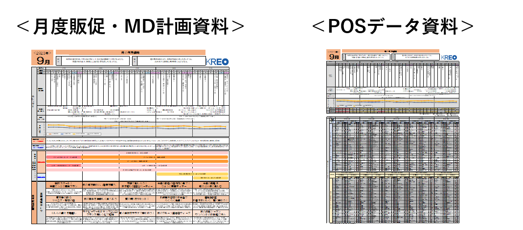 気象MDカレンダーでは、月度販促・MD計画資料とPOSデータ資料の二部構成にてご提供いたします。月度販促・MD計画資料は、一般的な月度計画資料のフォーマットに落とし込んでおり、月度計画資料のテンプレートとしてご活用頂けます。POSデータ資料では、52週ごとに支出金額・金額指数・年間順位の上位MDを掲載しており、自社の取りこぼし・強み商材の把握及び52週MD戦略の策定にご活用頂けます。