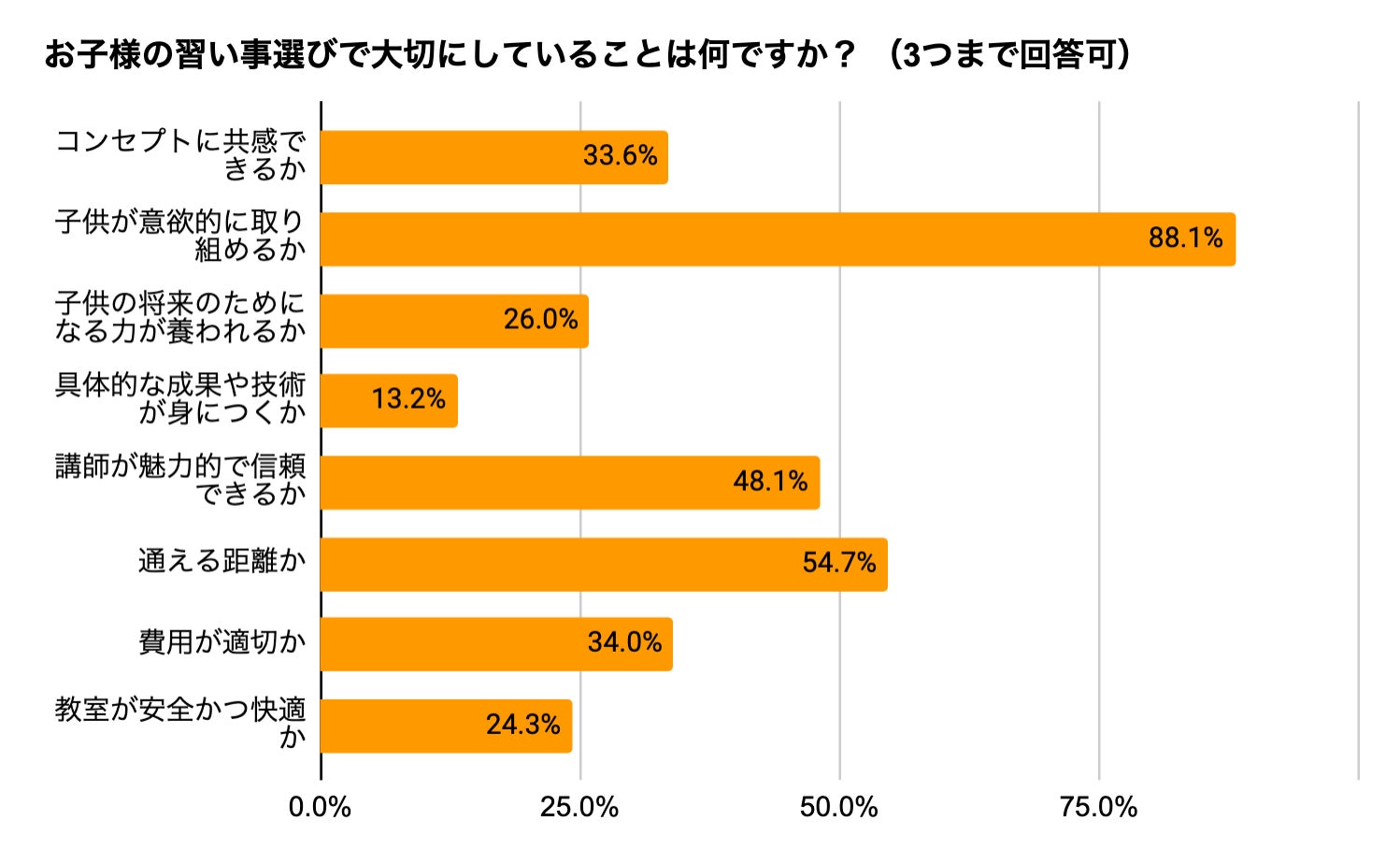 Visions Paletteが会員向けに行っているアンケートによると、「お子様の習い事選びで大切にしていることは何ですか?」という質問に対して、学芸大学、三軒茶屋、自由が丘、駒沢大学にある4つのアトリエに通う回答してくださった会員のうち、88.1%が「子どもが意欲的に取り組めるか」と回答しています。その他、「通える距離か」「講師が魅力的で信頼できるか」等も重要項目であると回答する方が多いことがわかりました。