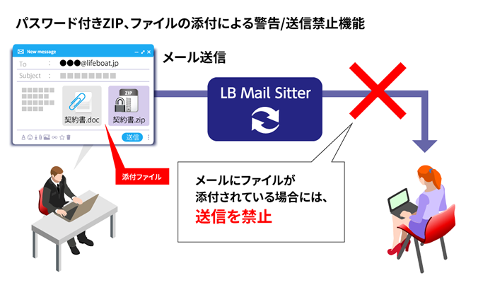 ファイルが添付されている場合、パスワード付きZIPファイル添付されている場合には、警告を表示させたり、送信を禁止することができます。また、特定の宛先(ドメイン)への添付ファイルの送信を禁止したり、警告を表示させることも可能です。