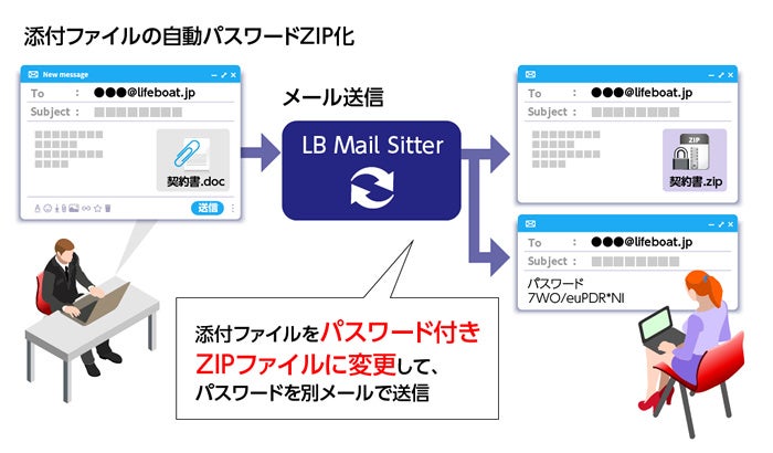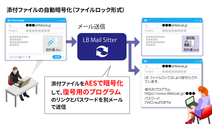 添付ファイルがある場合には、添付ファイルをLB ファイルロック形式(AES256)で暗号化して、解凍するためのプログラムのリンクと、パスワードを別メールで送付することが可能です。