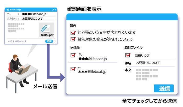 インストールするだけで、メール送信前に確認画面を表示させることができます。メールの送信先、添付ファイルなど、すべてチェックすることで送信が行えるようになります。添付漏れ、キーワードや宛先による警告を表示させることができます。社内宛てメールについては、確認画面を表示させない設定も可能です。新バージョンでは、確認画面で添付ファイルを参照できるようになりました。