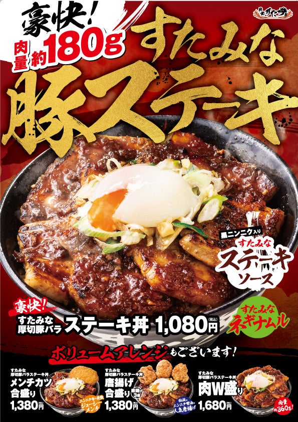 一方で毎年成人式以降は消費動向が下がる傾向にあり、連休でお金を使ってしまい節約を余儀なくされる方も多くいらっしゃるはずです。当店では『日本全国、さらには世界の人々の底力となる』という企業理念のもと、ボリュームがあって手ごろな価格で食べられるガッツリとした商品で連休明けでも腹いっぱい食べてすたみなをつけて頑張ってほしいという想いで『豪快!すたみな厚切豚バラステーキ丼』を発売することといたしました。
