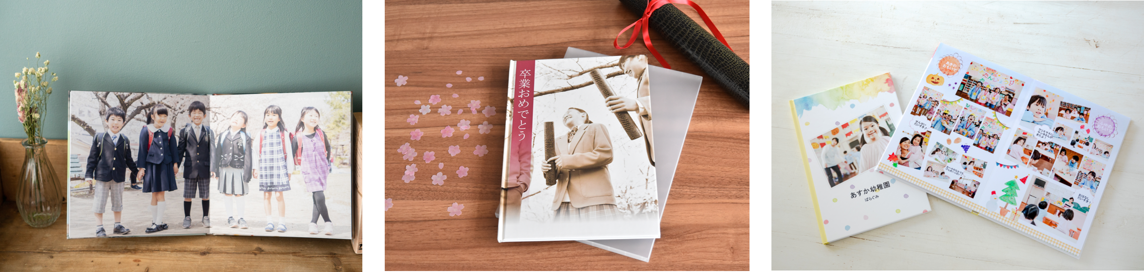 フォトブック、カレンダー、フォトカードなど豊富な商品ラインアップを取り揃え、作成方法も自由にデザインできるタイプから、スマホで手軽に作れるタイプまで用途に合わせてお選びいただけます。人生で1度きりの園・学校生活の思い出を世界に1つだけのオリジナルフォトブック・フォトグッズにして残してみませんか。