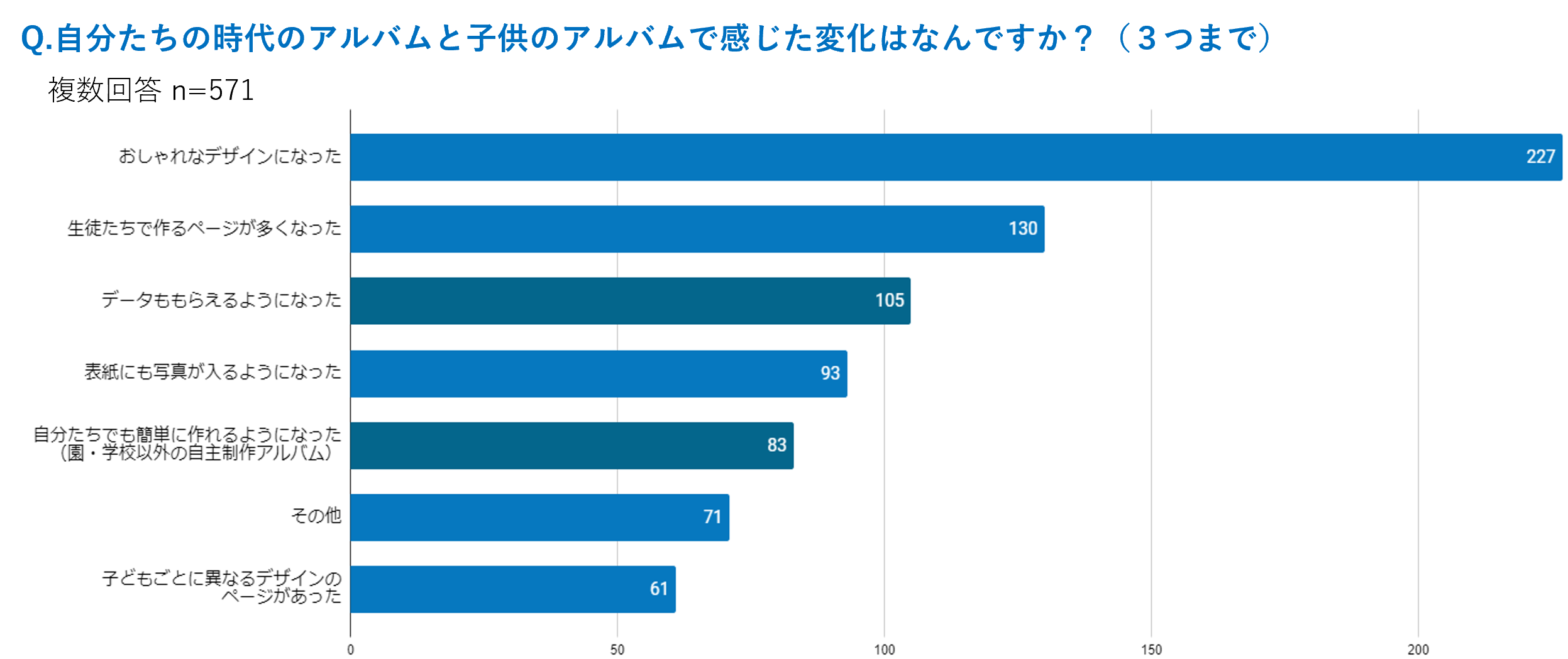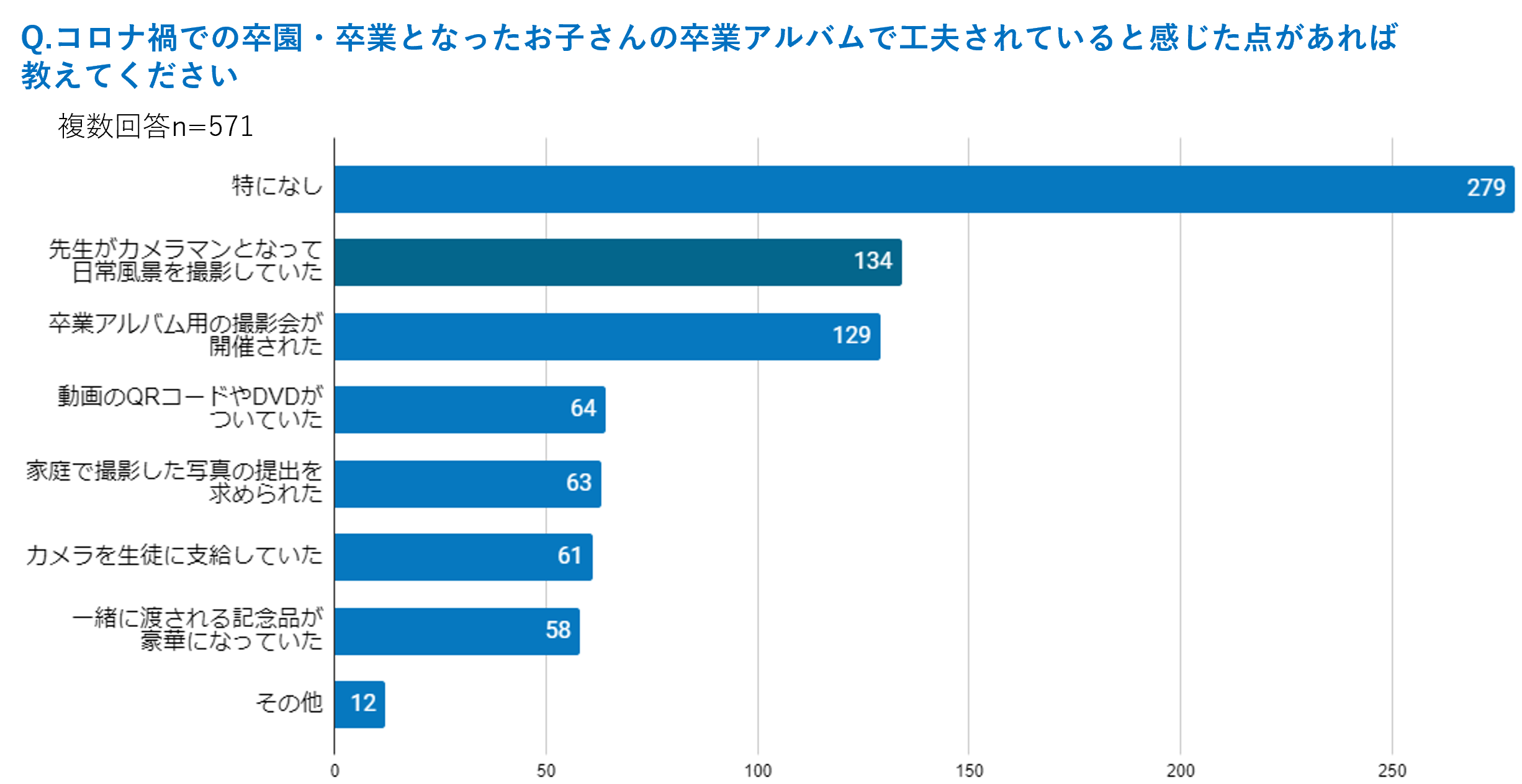 「コロナ禍での卒園・卒業となったお子さんの卒業アルバムで工夫されていると感じた点があれば教えてください」という問いに対して、興味深かった回答は「先生がカメラマンとなって日常風景を撮影していた」、「卒業アルバム用の撮影会が開催された」でした。例年は行事の写真が多くなりがちな卒業アルバムですが、コロナ禍で園・学校行事が縮小されていることも背景にあるのかもしれません。また、この中でも、「一緒に渡される記念品が豪華になっていた」と答えた人が58人もいたことから、コロナ禍ならではの園・学校による心遣いも感じられます。