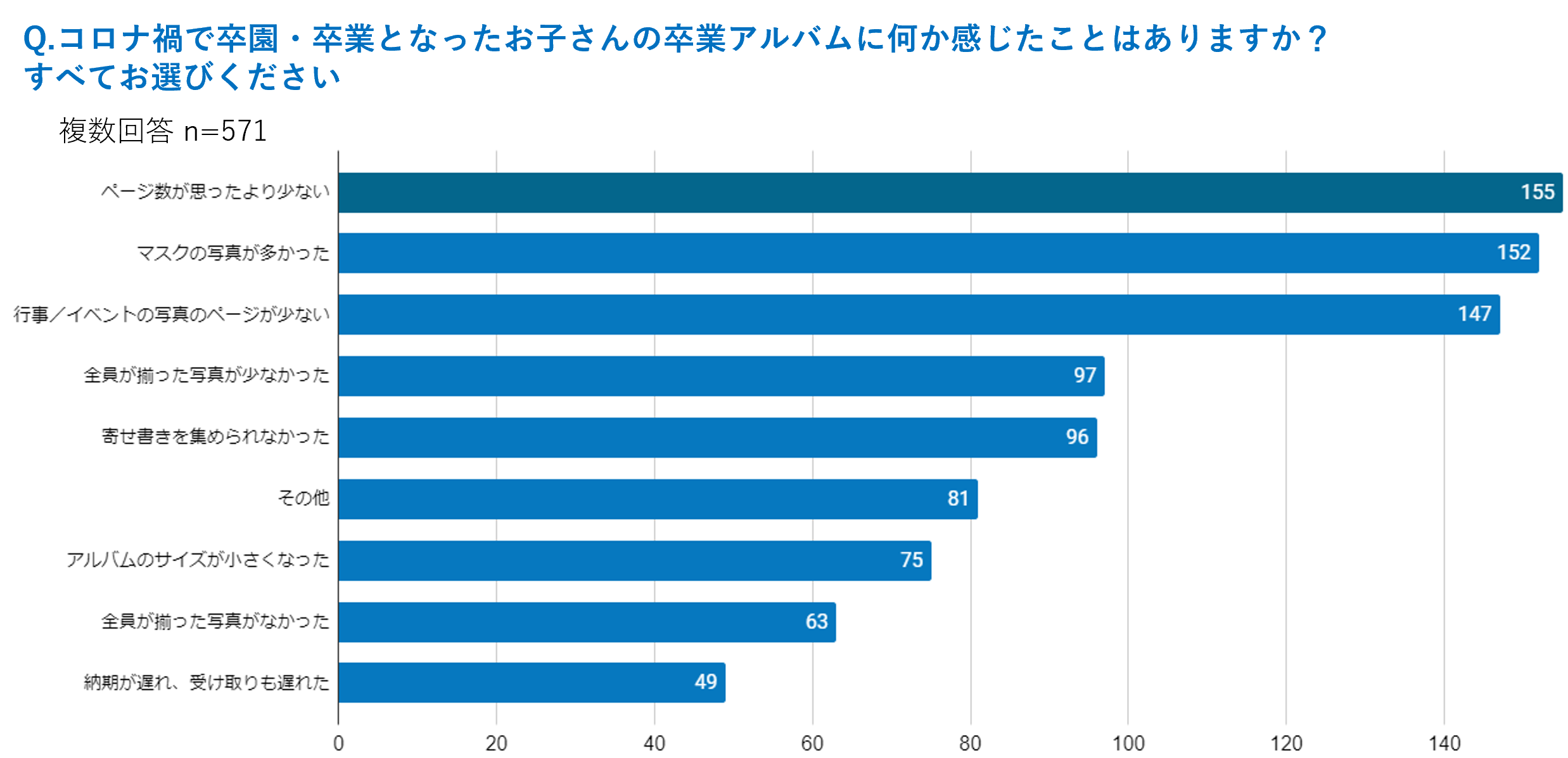 「コロナ禍で卒園・卒業となったお子さんの卒業アルバムに何か感じたことはありますか? 」という問いに対して、1番多かった回答は、「ページ数が思ったより少ない」でした。2番目は「マスクの写真が多かった」、3番目は「行事/イベントの写真のページが少ない」という結果になりました。「ページ数が思ったよりも少ない」という結果が1番になった要因として、コロナ禍という社会情勢を背景に、園・学校生活での思い出の写真を撮る機会が減少していることも推察されます。また、その後に続く回答もコロナ禍ならではの結果になったのではないでしょうか。