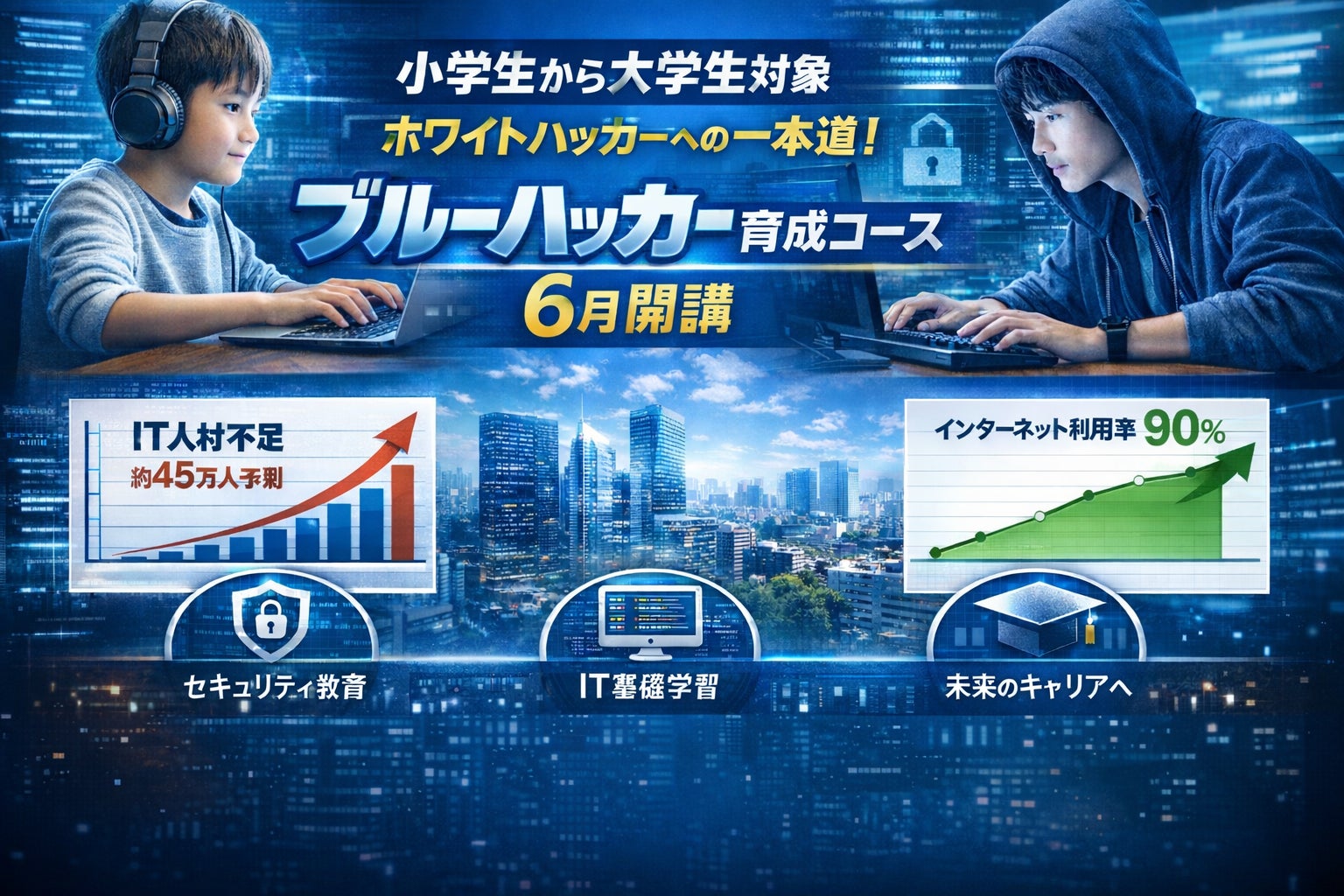 ヒートウェーブ株式会社(本社:東京都新宿区/代表取締役:林田かおる)が運営するIT・サイバーセキュリティ教育ブランド「セキュ塾」は、学生向けの新プログラム『ブルーハッカー育成コース』を2026年6月より開講いたします。本コースは、小学生から大学生までを対象に、IT基礎からプログラミング、ネットワーク、サーバー、サイバーセキュリティまでを段階的に学べる月謝制ITスクールです。