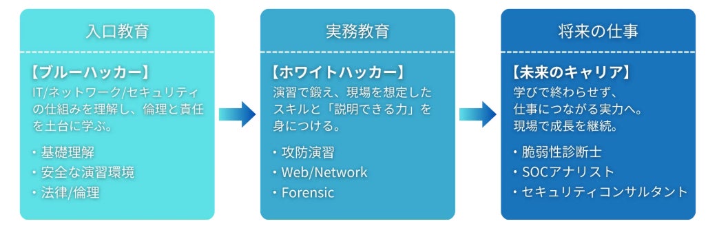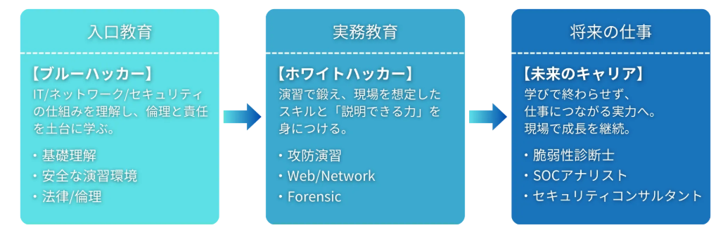 ブルーハッカー育成コースは、単なるプログラミング教育ではなく、法律・情報モラルを含めた総合的なIT教育を提供する学生向けITスクールとして設計されました。