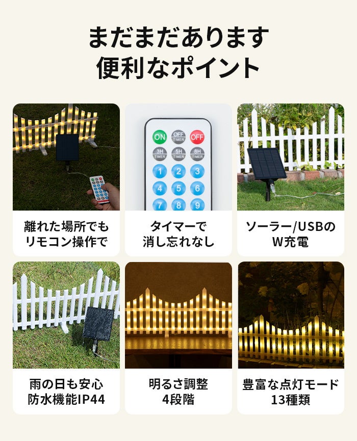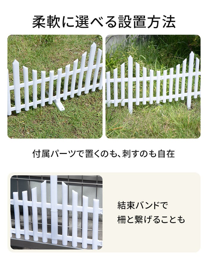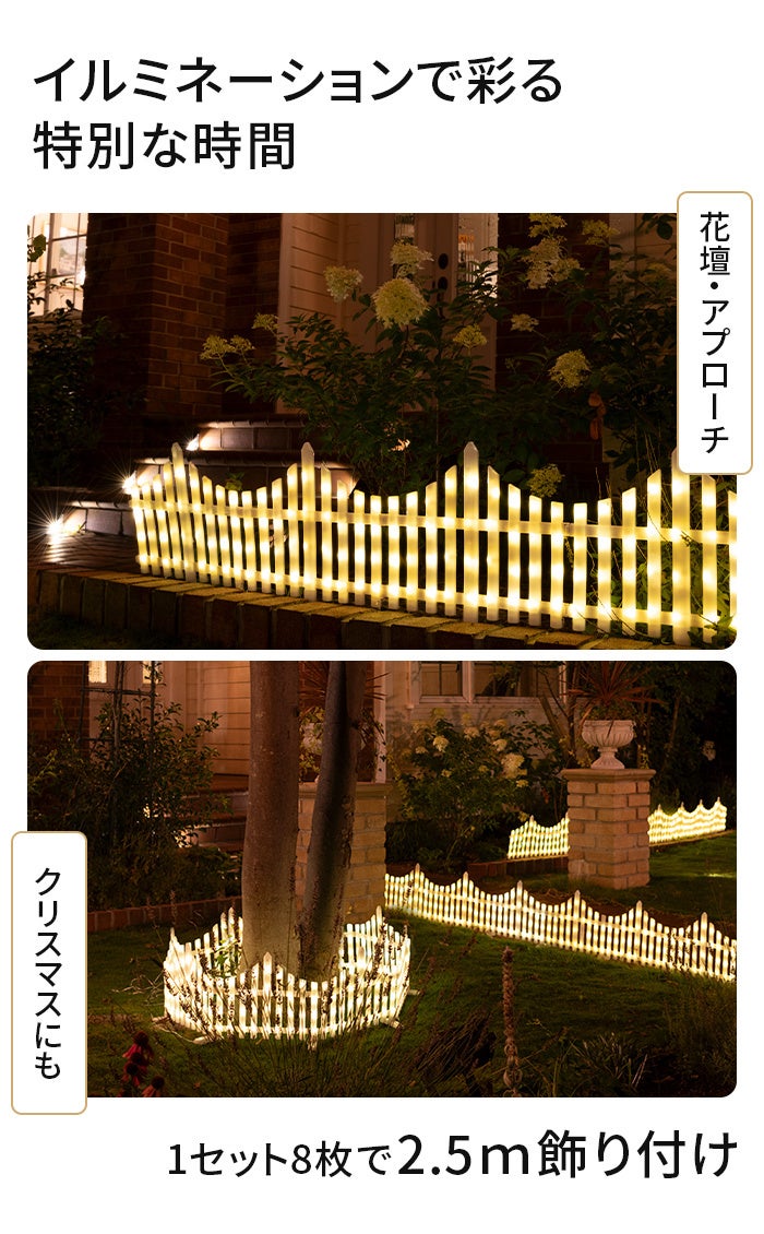 昼は白色のかわいらしいフェンスとして、夜は自動点灯で幻想的なイルミネーションに。景観に自然と馴染みます。連結して長さを調整できるので、お好みの長さで使用できます。