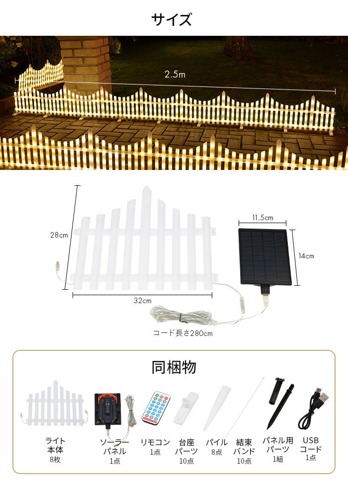 サイズ:全長2.5m / ライト本体1枚 28×32cm / ソーラーパネル 11.5×14cm