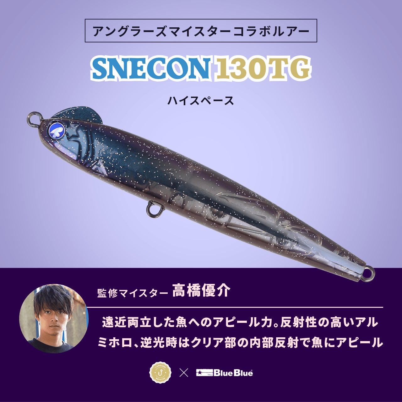 釣り人の夢を叶える企画として、アングラーズマイスターが釣り人に新たな価値を提供することを目的として本企画は始まりました。BlueBlueの人気ルアー「スネコン130S」をカスタムチューンし、アングラーズマイスターならではの工夫を取り入れて完成した『スネコン130TG』。