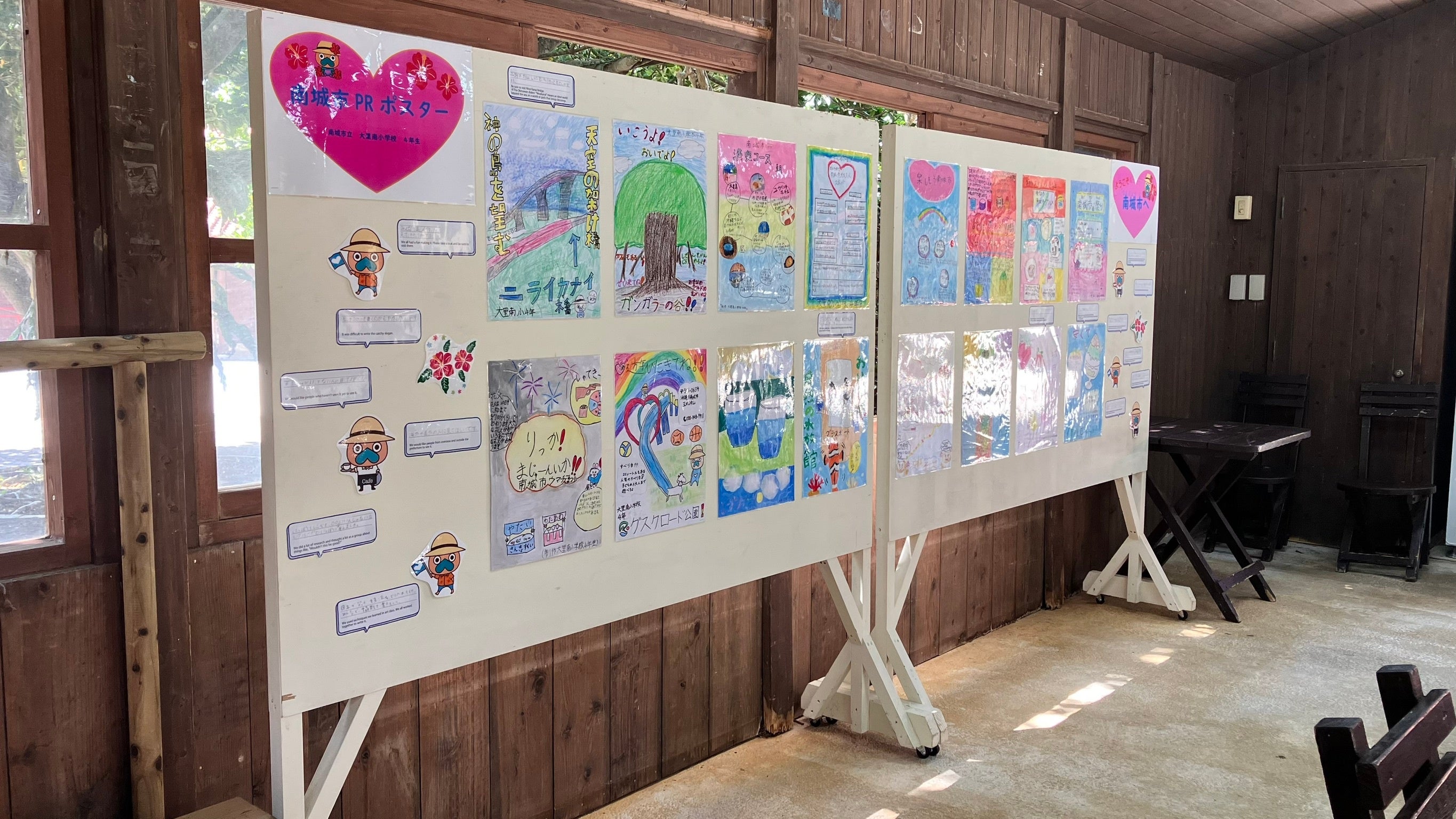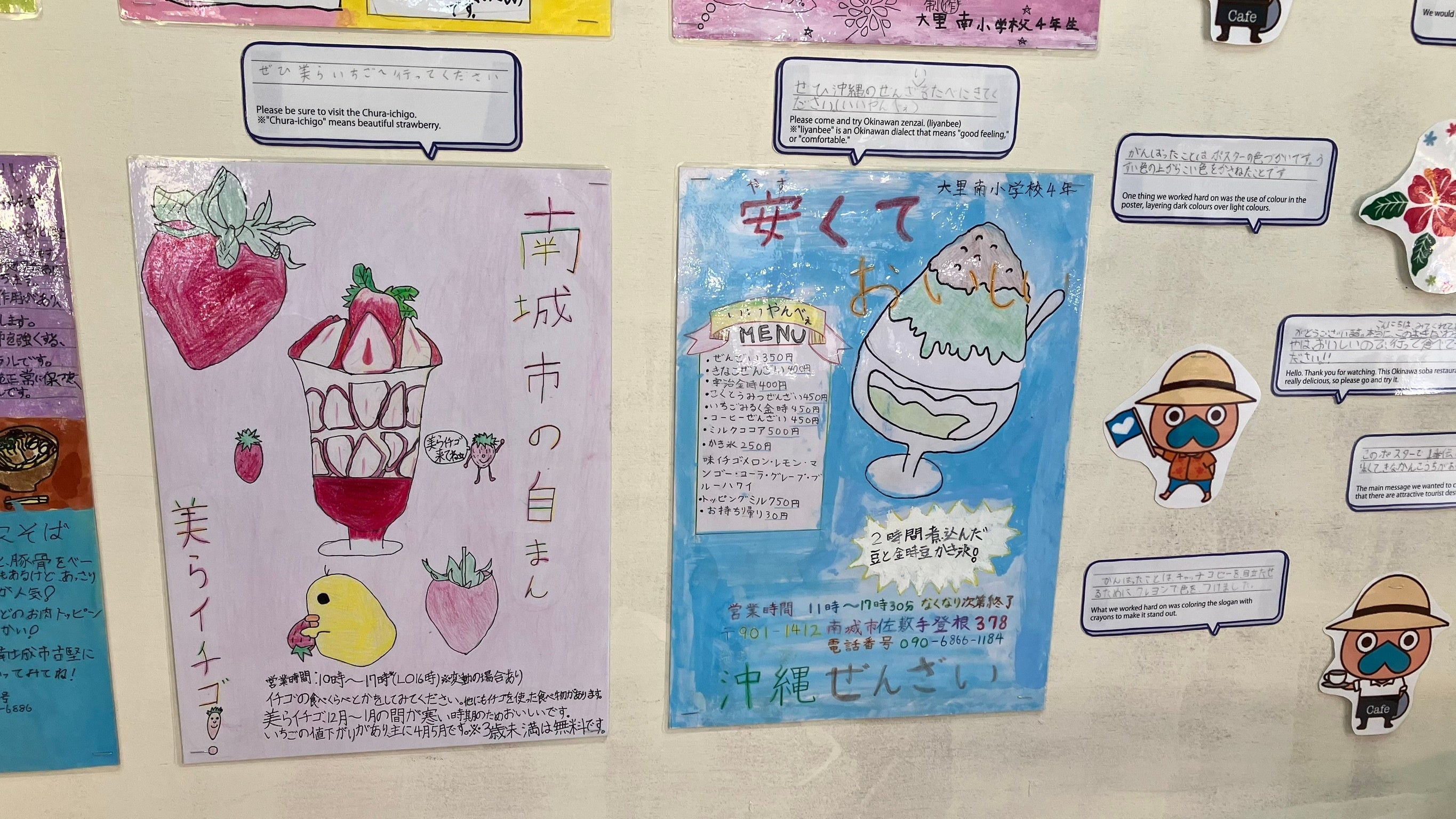 南城市大里南小学校4年生が地域学習として「わたしたちのまちの魅力を伝えよう」をテーマに、自分たちの地域の魅力を発信するために制作したポスターを展示しています。