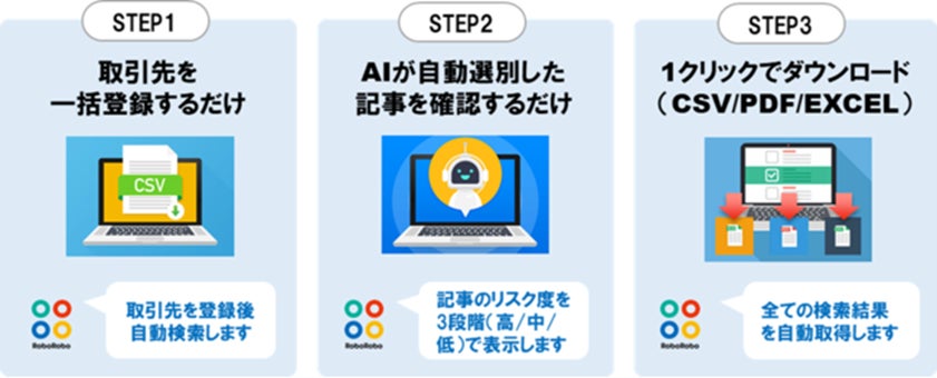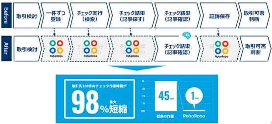 当社は、「RoboRoboコンプライアンスチェック」の提供を通し、取引先の犯罪・不祥事への関与などコンプライアンスリスクのチェックに対する企業ニーズが急速に高まるなか、コンプライアンス業務に従事されている企業様全ての定型作業と情報集約型の作業からの解放を通じて、「働き方改革」推進を今後も目指して参ります。