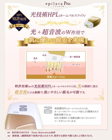 特許技術の光技術HPL(ホームパルスライト)は、光の照射に加え、超音波による振動で、肌にやさしい脱毛を可能にしました。「エステを予約してその都度サロンに通うのが大変…。」「エステは高額だし、もっと手軽に脱毛したい」というお客様の声にお応えし、エステと同じ効果をお家でいつでも体感できる、家庭用光脱毛器「エピレタプロ EP-0230-N」を発売しました。