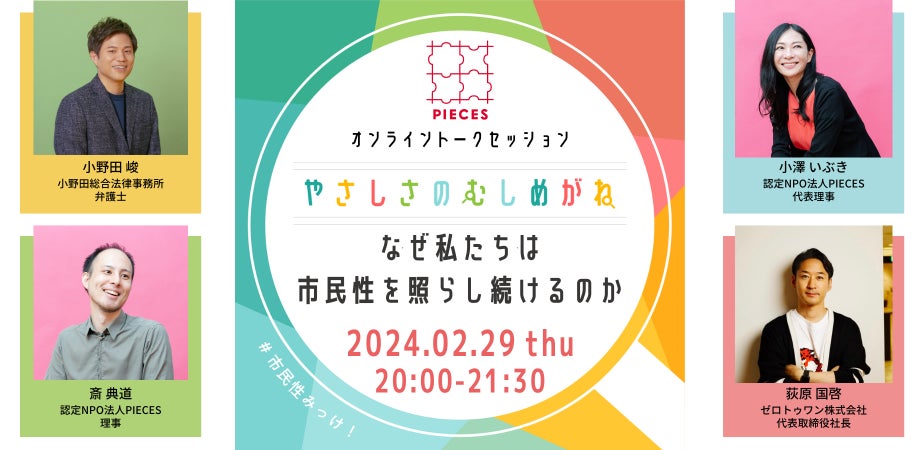 トークイベントでは、2016年のPIECES創業時から活動を続けてきた小澤いぶきと斎典道、理事として参画している小野田峻氏、荻原国啓氏とともに、「なぜ私たちは市民性を照らし続けるのか」を改めて問い直し、PIECESのあり方やこれからのひろがりについてお話しします。