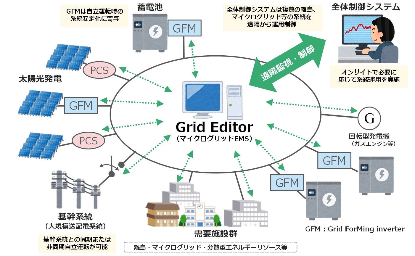 パシフィックコンサルタンツ株式会社(住所:東京都千代田区、代表取締役社長:重永智之)とパシフィックコンサルタンツグループ(以下、当社グループ)のパシフィックパワー株式会社(住所:東京都千代田区、代表取締役社長:合津美智子)は、2019~2021年度にかけて環境省によるCO2排出削減対策強化誘導型技術開発・実証事業の一環として、環境エネルギー技術研究所株式会社、株式会社東芝、および国立研究開発法人産業技術総合研究所との共同により、「変動性再生可能エネルギーの活用に向けた仮想同期発電機概念に基づく連系用インバータ制御技術の開発」(以下、本開発)に取り組んできた結果、マイクログリッド内において同期発電機と一体運用ができる同期化力と慣性力を有するインバータ「グリッドフォーミングインバータ/Grid Forming Inverter(以下、GFM)」及びマイクログリッドの制御システム「グリッドエディタ/Grid Editor」を開発しましたのでお知らせいたします。