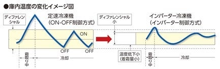 冷却負荷の変化に対応して、圧縮機の回転をインバーター制御。これにより蒸発温度のディファレンシャルを小さくした運転ができます。また蒸発温度を一定に制御することにより蒸発器への着霜が減り、除霜時間や除霜回数が削減できるため、安定した温度管理がしやすくなります。