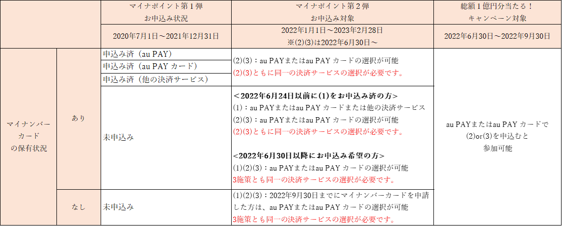 すべてau PAYまたはau PAY カードでお申し込みされた方が対象です。マイナンバーカードを取得した方のうち、マイナポイント第1弾の未申込者も含みます。