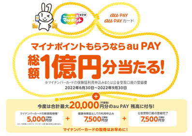 2022年1月1日から実施中の施策「マイナンバーカード新規取得者への最大5,000円分付与」と合わせると、最大2万円分のマイナポイントをau PAY 残高として付与します。