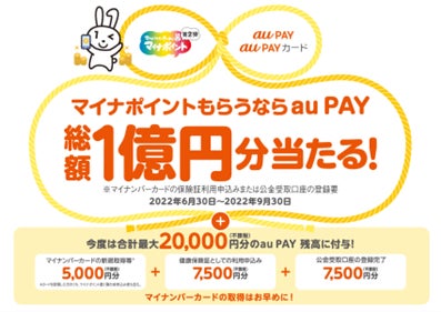 マイナポイントもらうならau PAY、6月30日から総額1億円分が当たるキャンペーン開催