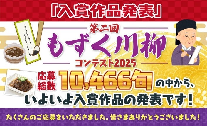 海藻の総合メーカーであるカネリョウ海藻株式会社(代表取締役社長:髙木良樹 所在地:熊本県宇土市笹原町1544)では、2025年2月より『第二回 もずく川柳コンテスト2025』を開催いたしました。本コンテストは、『めかぶ川柳コンテスト』のスピンオフ企画として、昨年初めて実施された『もずく川柳コンテスト』の第二回目の開催になります。