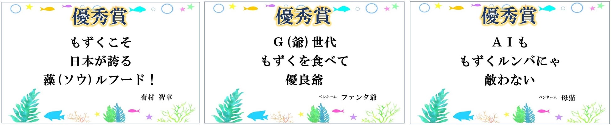 また、沖縄県をはじめ、今年度より新たに、沖縄県もずく養殖業振興協議会にご後援をいただき、「沖縄県もずく養殖業振興協議会会長賞」を新設いたしました。今後も産地との連携を深めながら、もずくの魅力をより多くの方々に届け、一層の盛り上がりを図ってまいります。