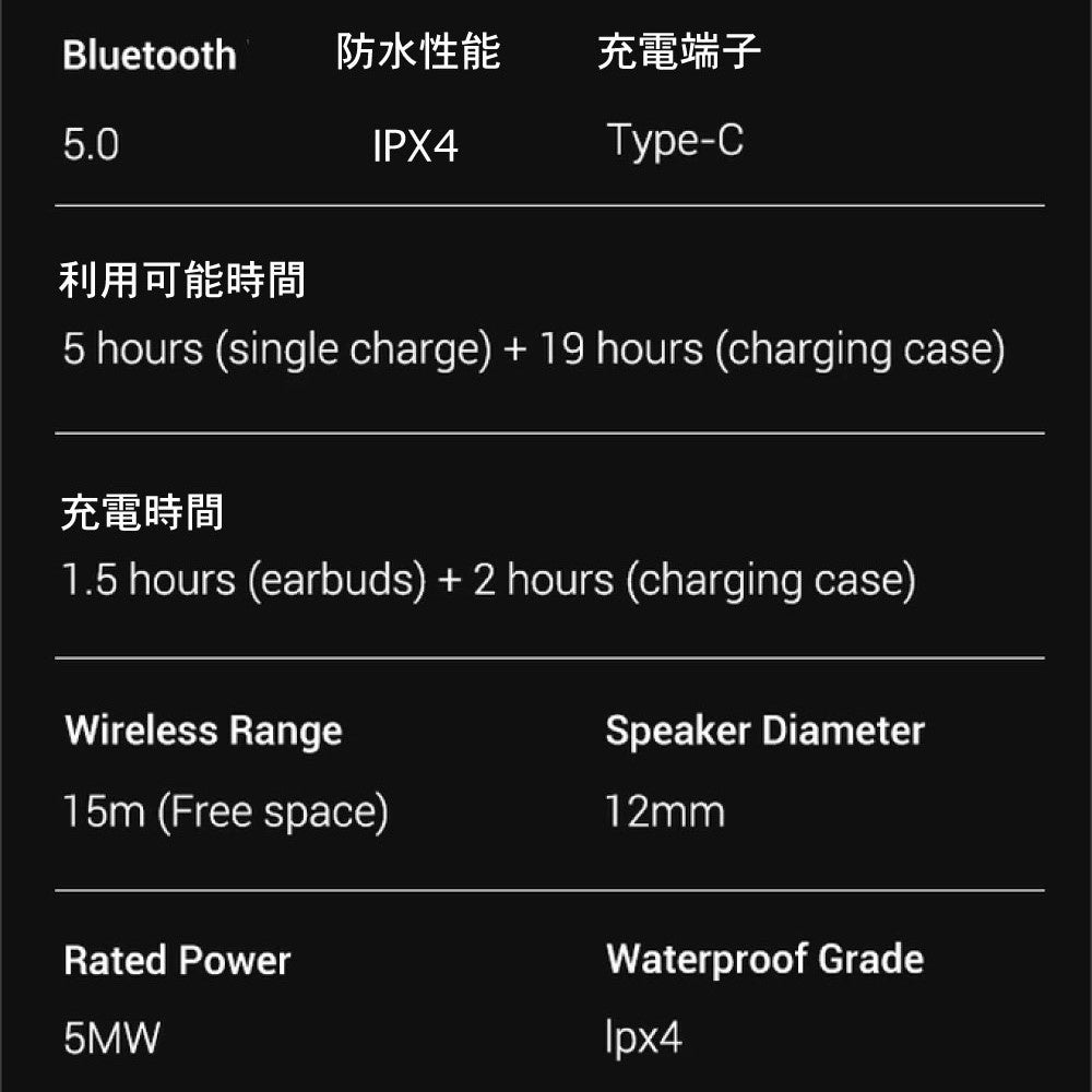 連続使用 最大5時間、充電ケースでの充電が可能なので外出先でパワーがなくなってきても、ケースに入れて充電が可能。最大24時間の稼働が可能です。