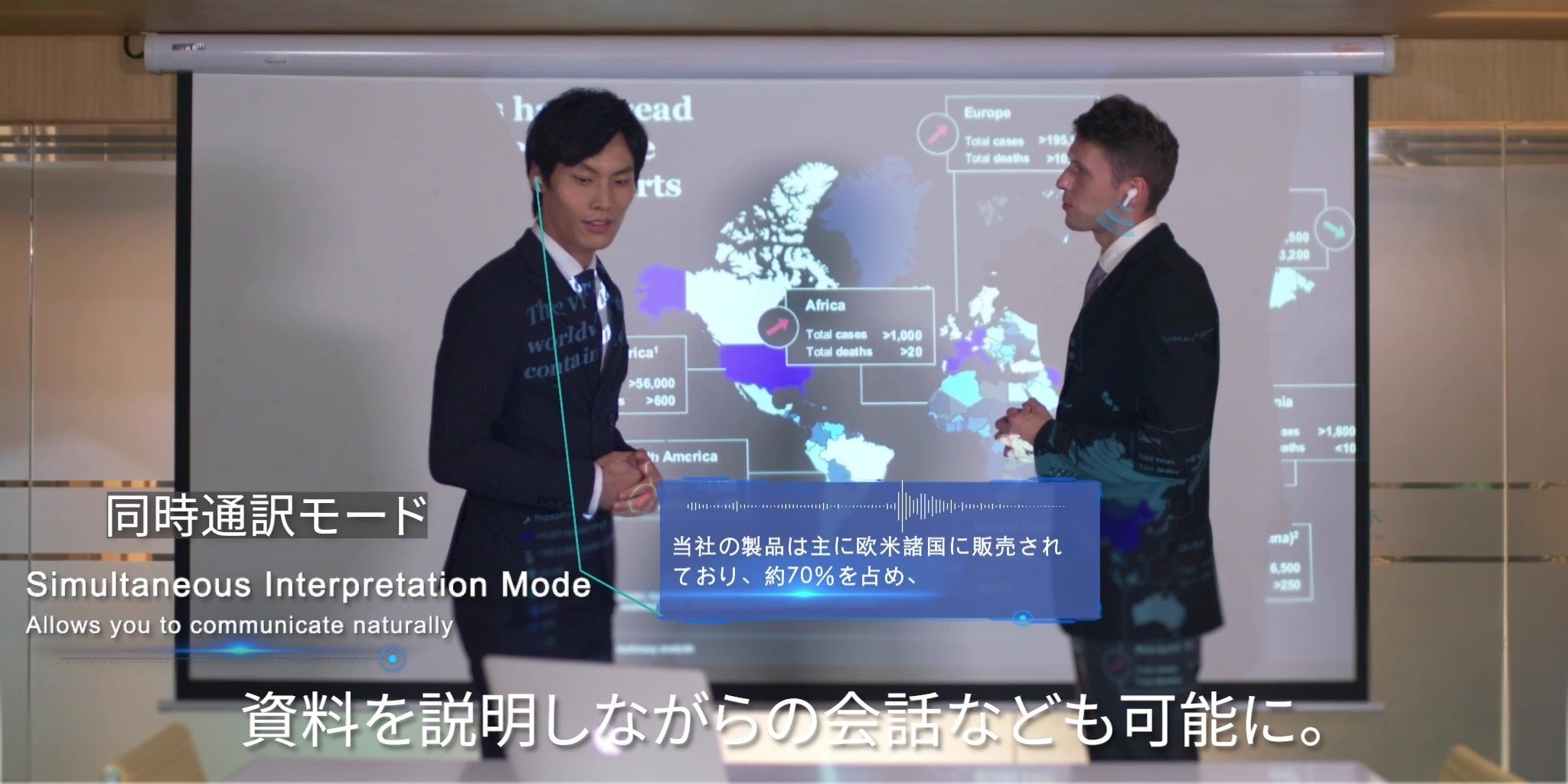 同時翻訳タッチモードはイヤホンの片方をパートナーに装着してもらうだけで、「双方の会話がリアルタイムで翻訳」されます。さまざまな国籍のビジネスパートナーと自然な会話を可能にします。