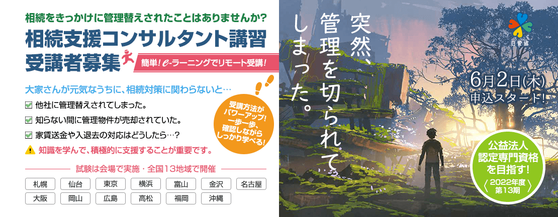 公益財団法人日本賃貸住宅管理協会(本部:東京都千代田区、会長:塩見紀昭、以下:日管協)は、2022年6月2日(木)より「相続支援コンサルタント講習(以下、一般講習)」および「上級相続支援コンサルタント講習(以下、上級講習)」の募集開始をお知らせします。本資格は、講習の受講後、認定試験に合格した方が取得できます。