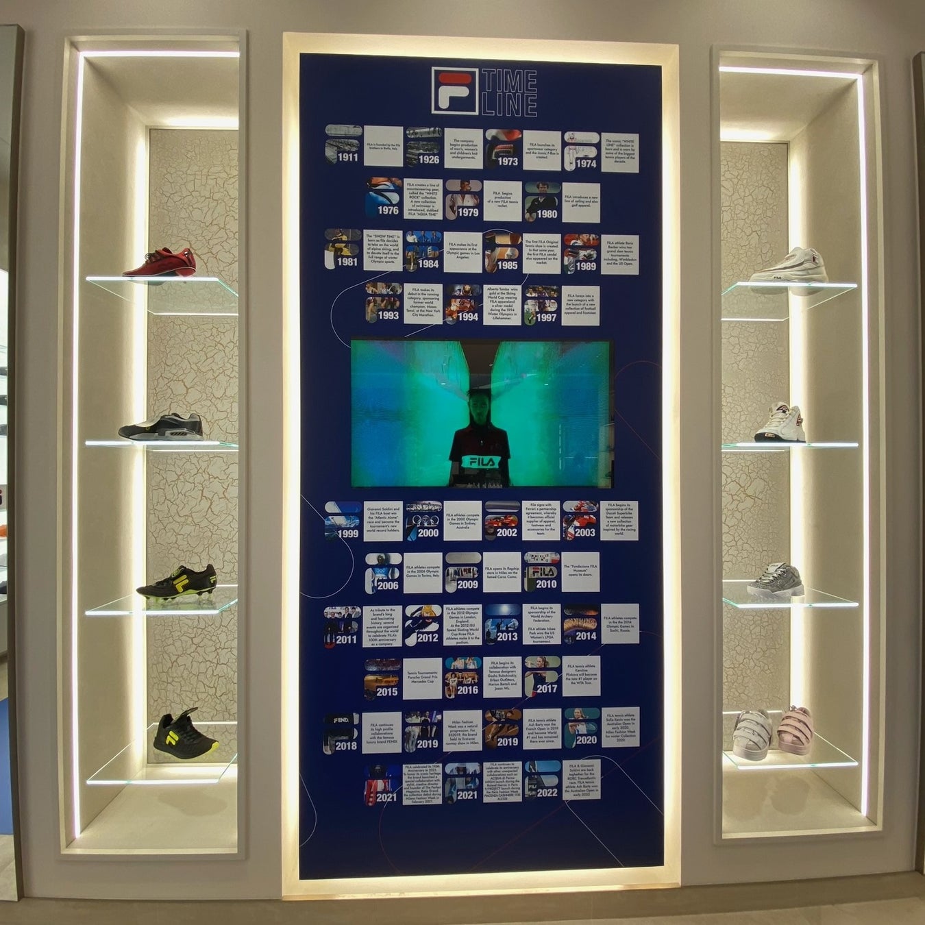 展開中のFILAショップの中では、国内最大級の売場面積を誇り、物販のみならずブランドヒストリーを紹介するアーカイブコーナーも設置。FILAの世界観も楽しんで頂ける国内唯一の空間となっています。