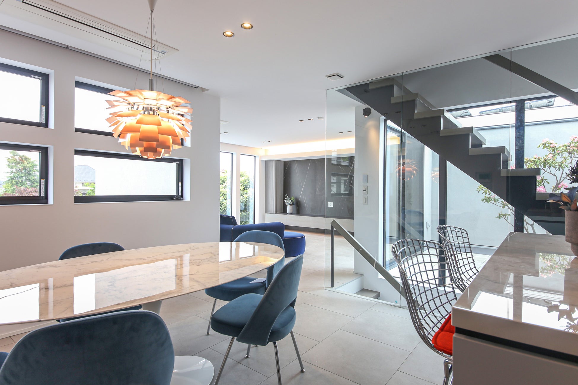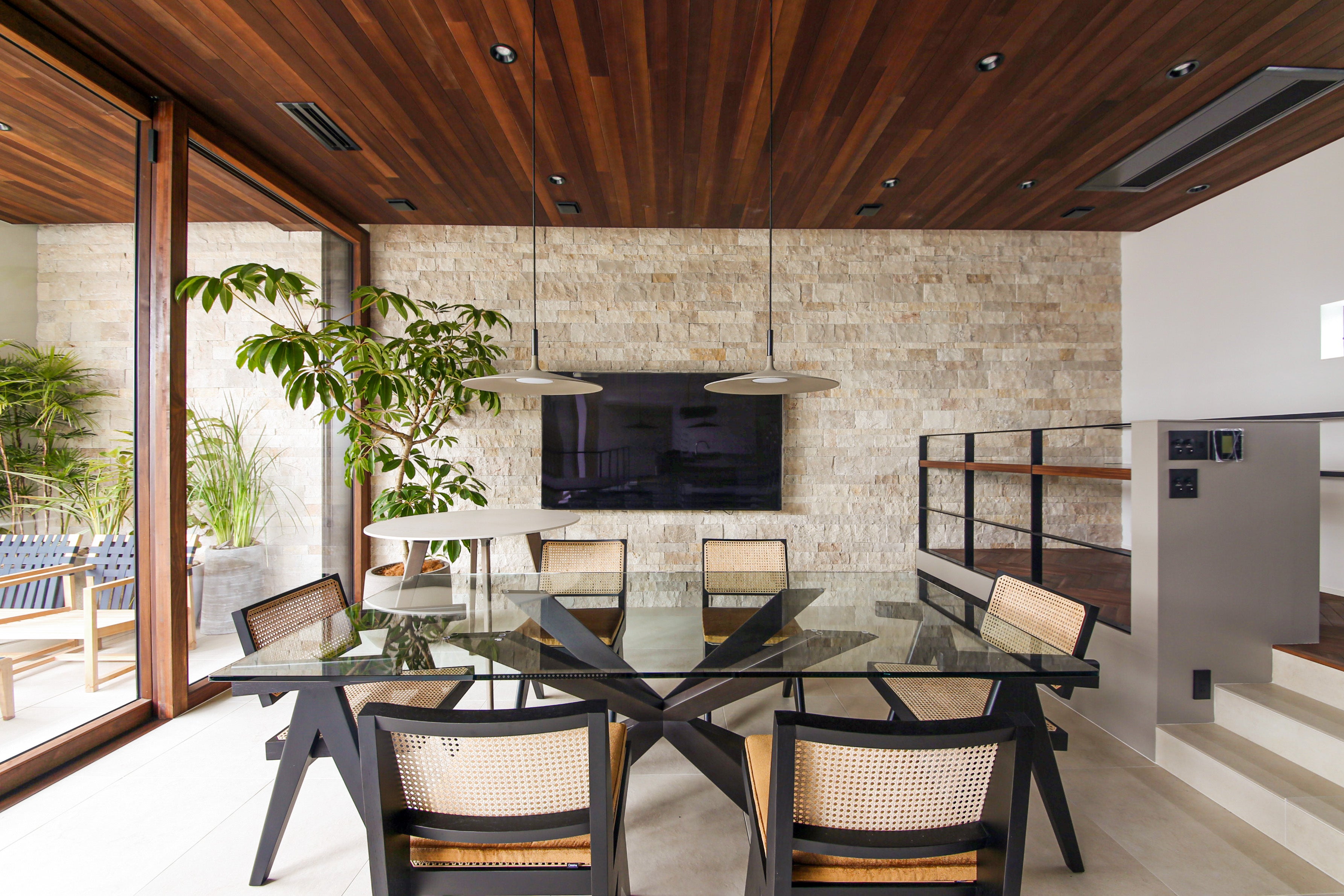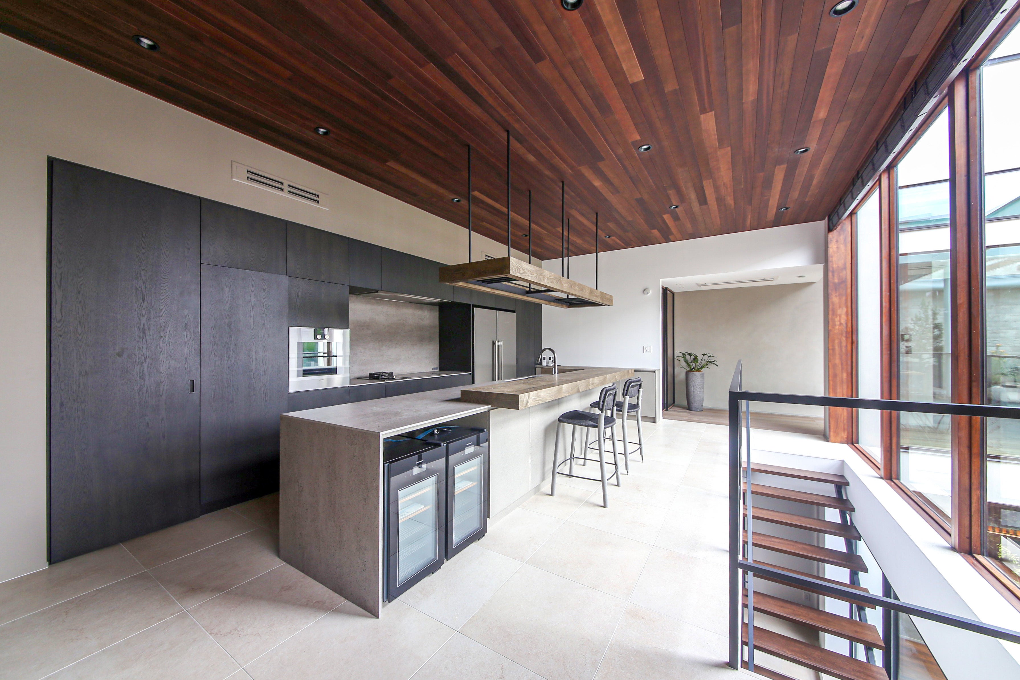 二つ目は「コントラスト」があることです。大きな住宅内で場の移動にリズムが生まれるよう、空間の大きさに抑揚を付けました。天井の低いアプローチから玄関を通り、中庭に視線が抜ける広いホールへ。階段を上がると大きなダイニングキッチンから高天井のリビングへは天井高を抑えた中間領域を経由します。テラスも屋根付き、可動屋根付き、屋根無しの3種類の空間を設けコントラストを持たせています。