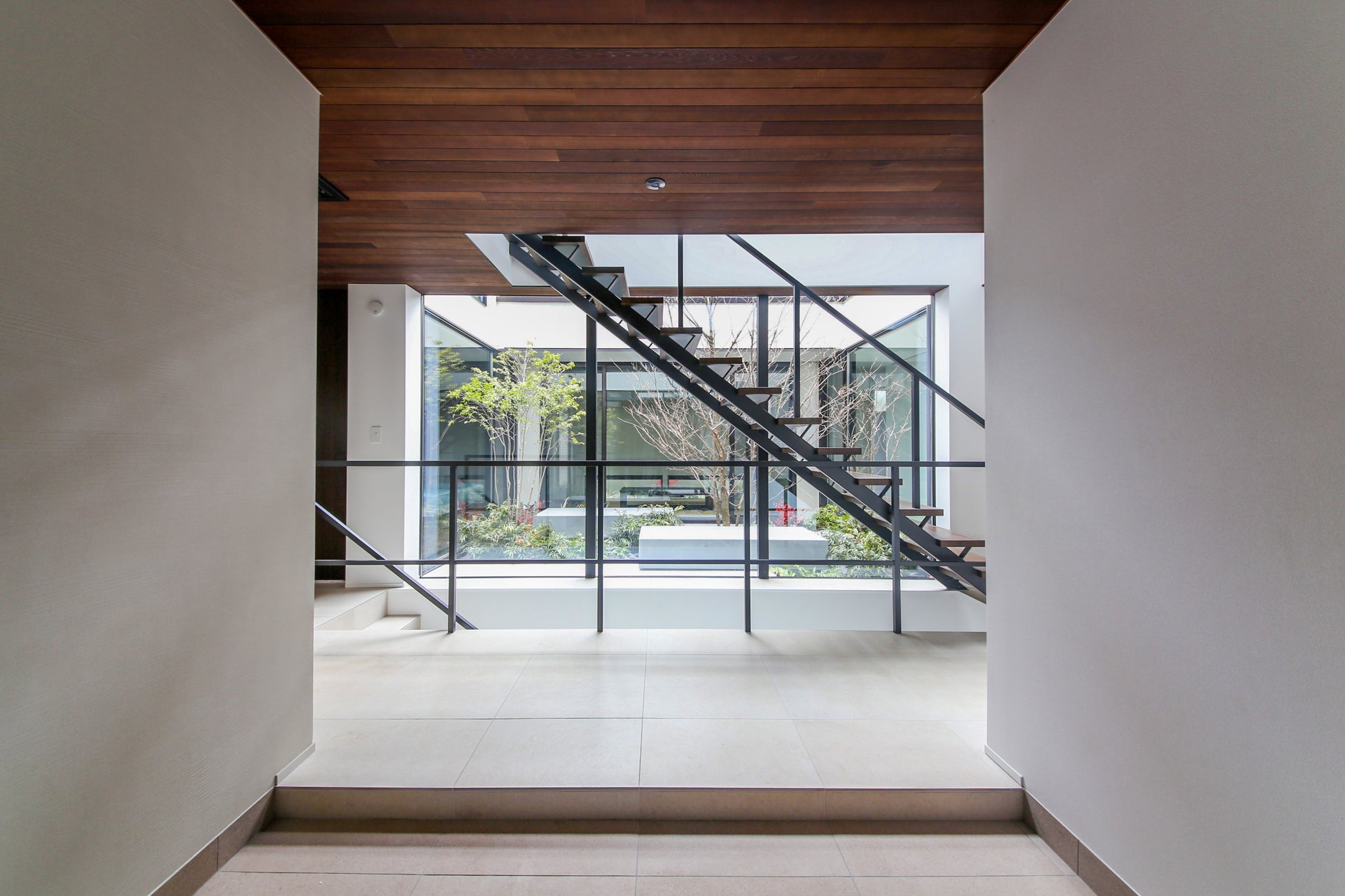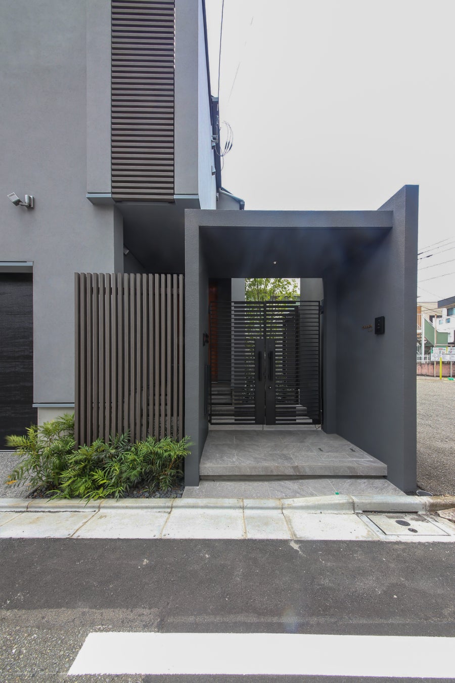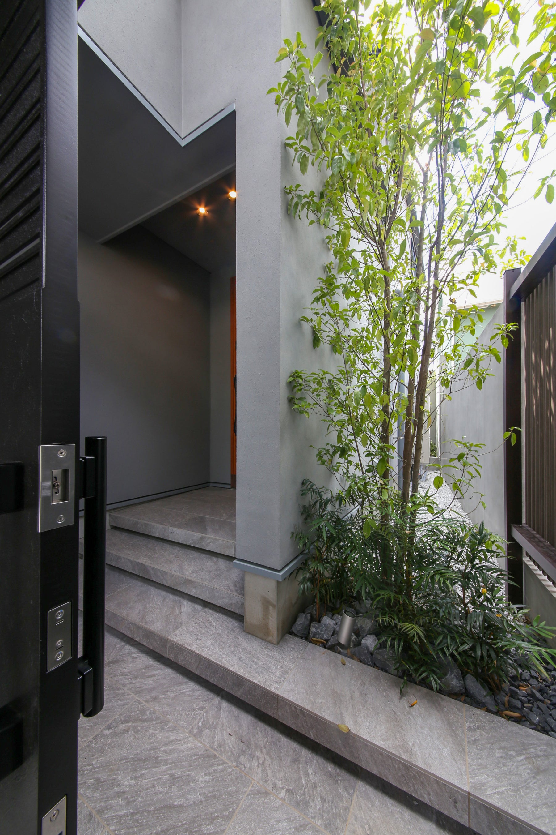門扉から玄関、玄関からLDKのある階段への動線にそれぞれ緑を配置し、雰囲気のあるおもてなしの空間を演出。主寝室・WIC・シャワールームをホテルのような連続した配置とし、来客と家族がそれぞれ気兼ねなく楽しめるゾーニングとすることで、寛げる空間構成を実現しました。