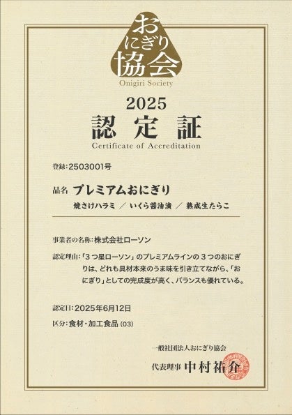 一般社団法人おにぎり協会(神奈川県鎌倉市、代表理事 中村祐介)は2025年6月12日、株式会社ローソン(本社:東京都品川区)が展開する新プライベートブランド「3つ星ローソン」ラインのプレミアムおにぎり3商品を、おにぎり協会認定商品として正式に認定しました。