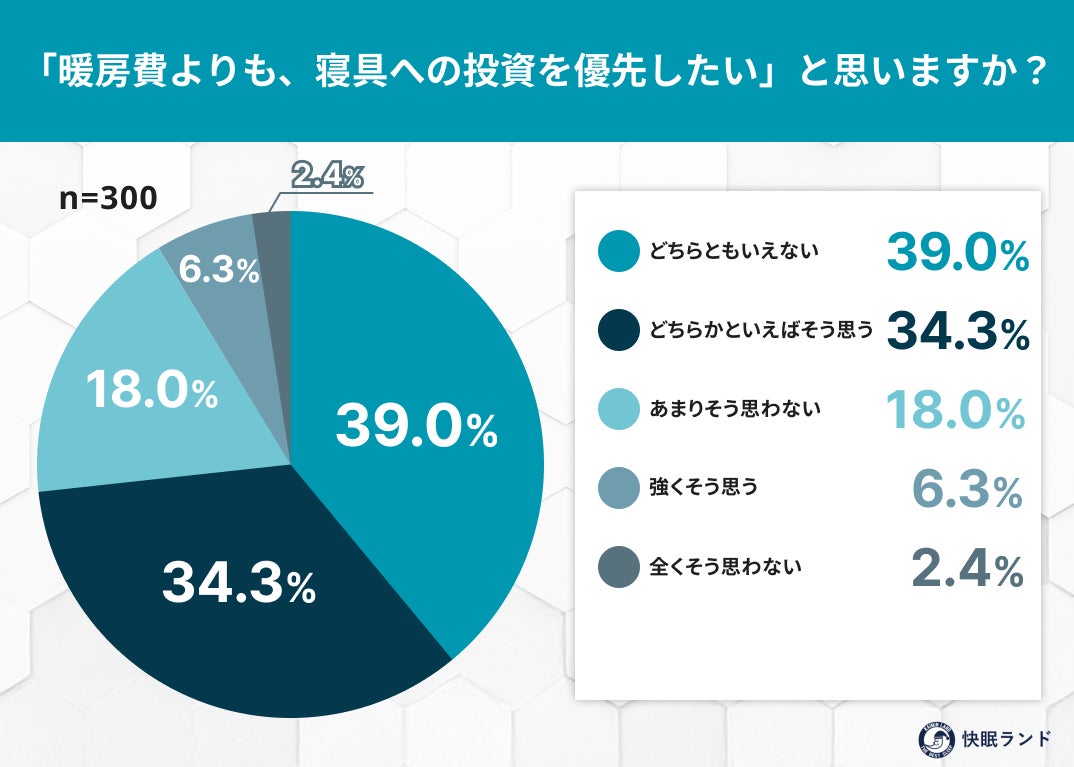 →「どちらかといえばそう思う」34.3%、「強くそう思う」6.3%で、計40.6%が“寝具投資派”という結果に。光熱費高騰を背景に、“暖房費の削減 × 快眠の確保”を同時に目指す人が増えている。